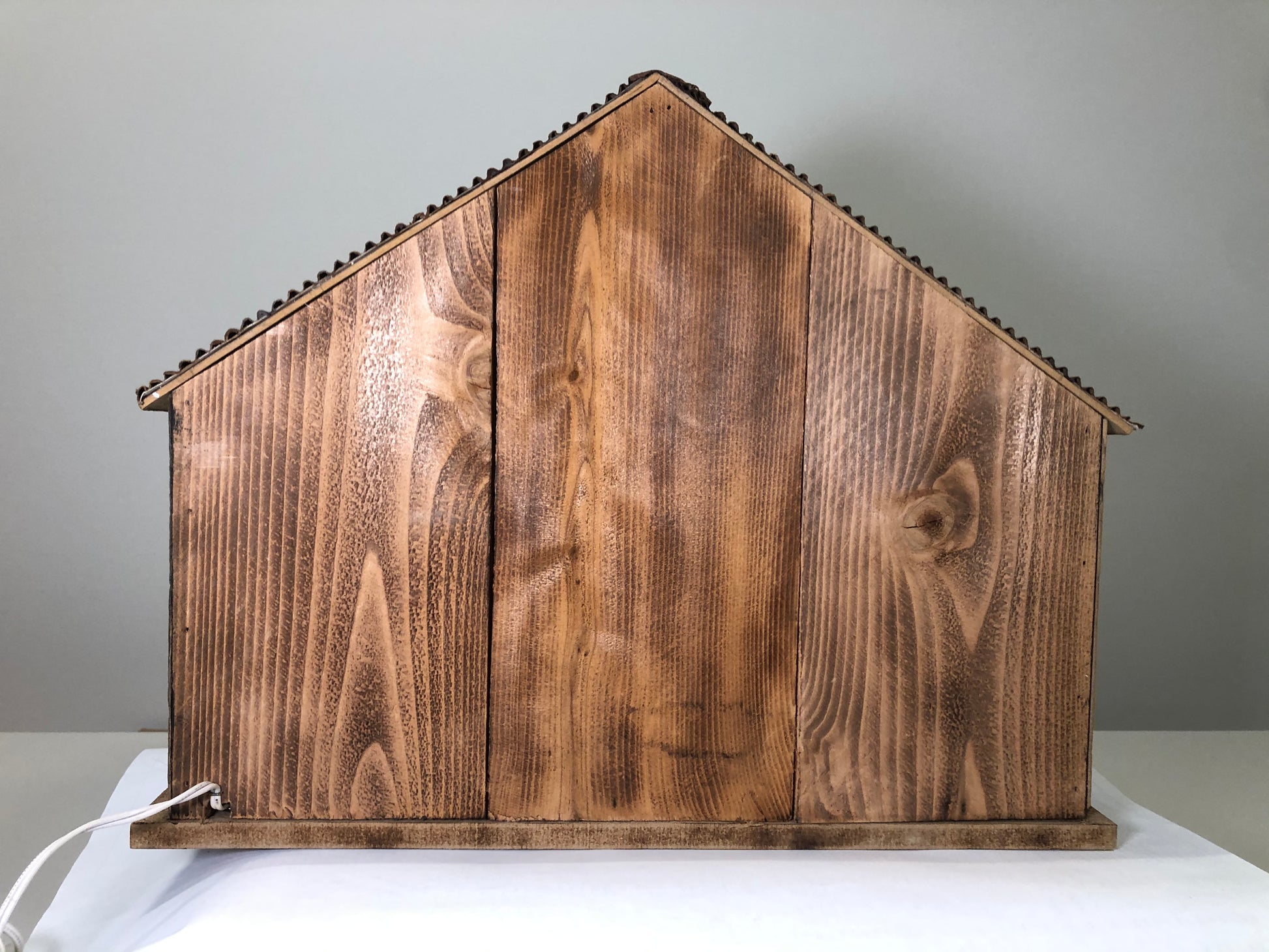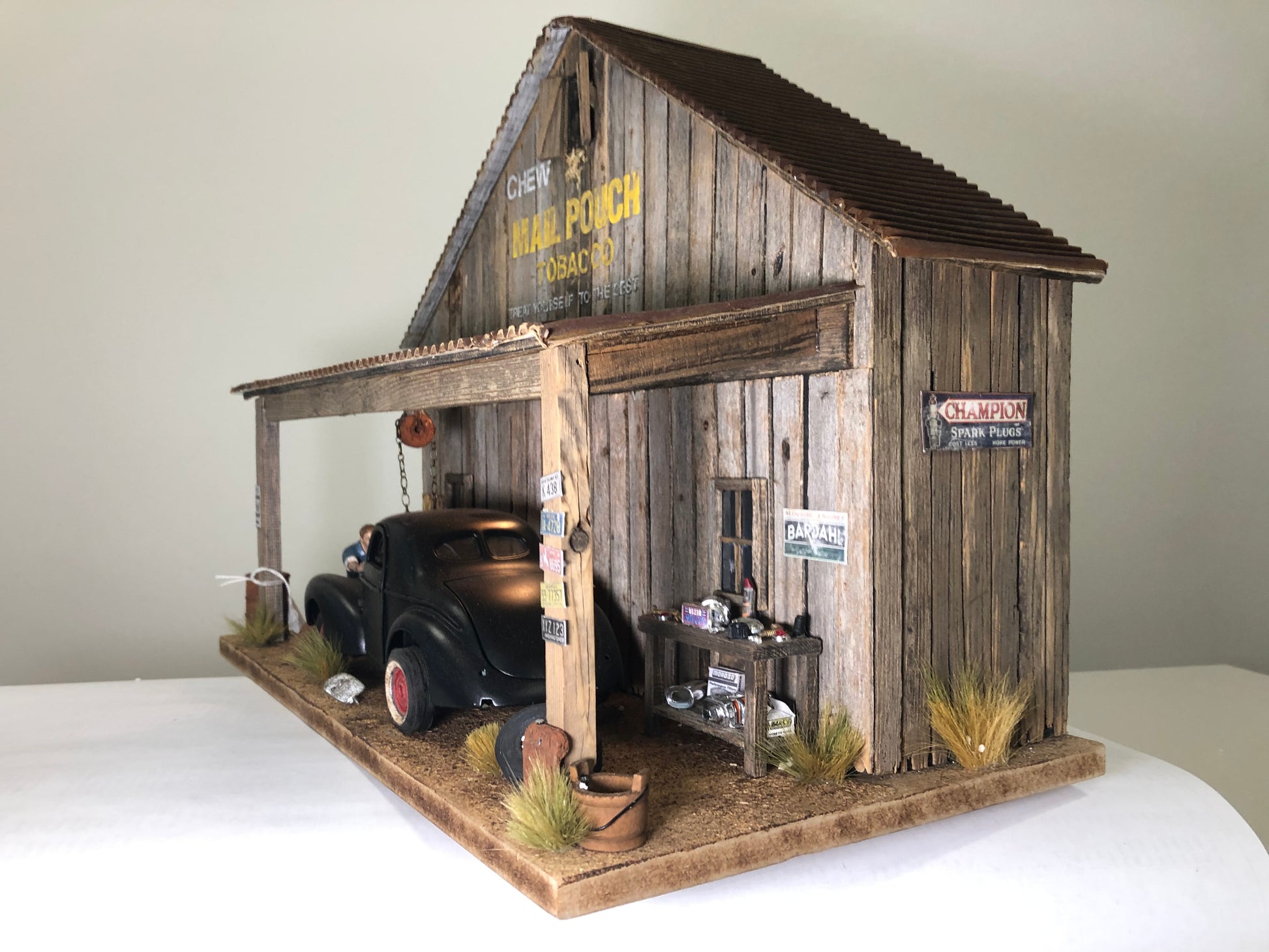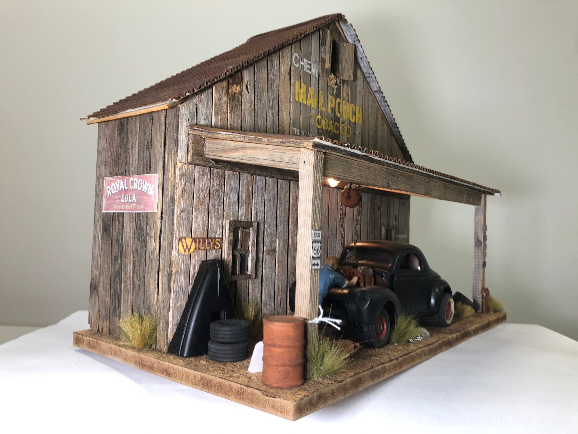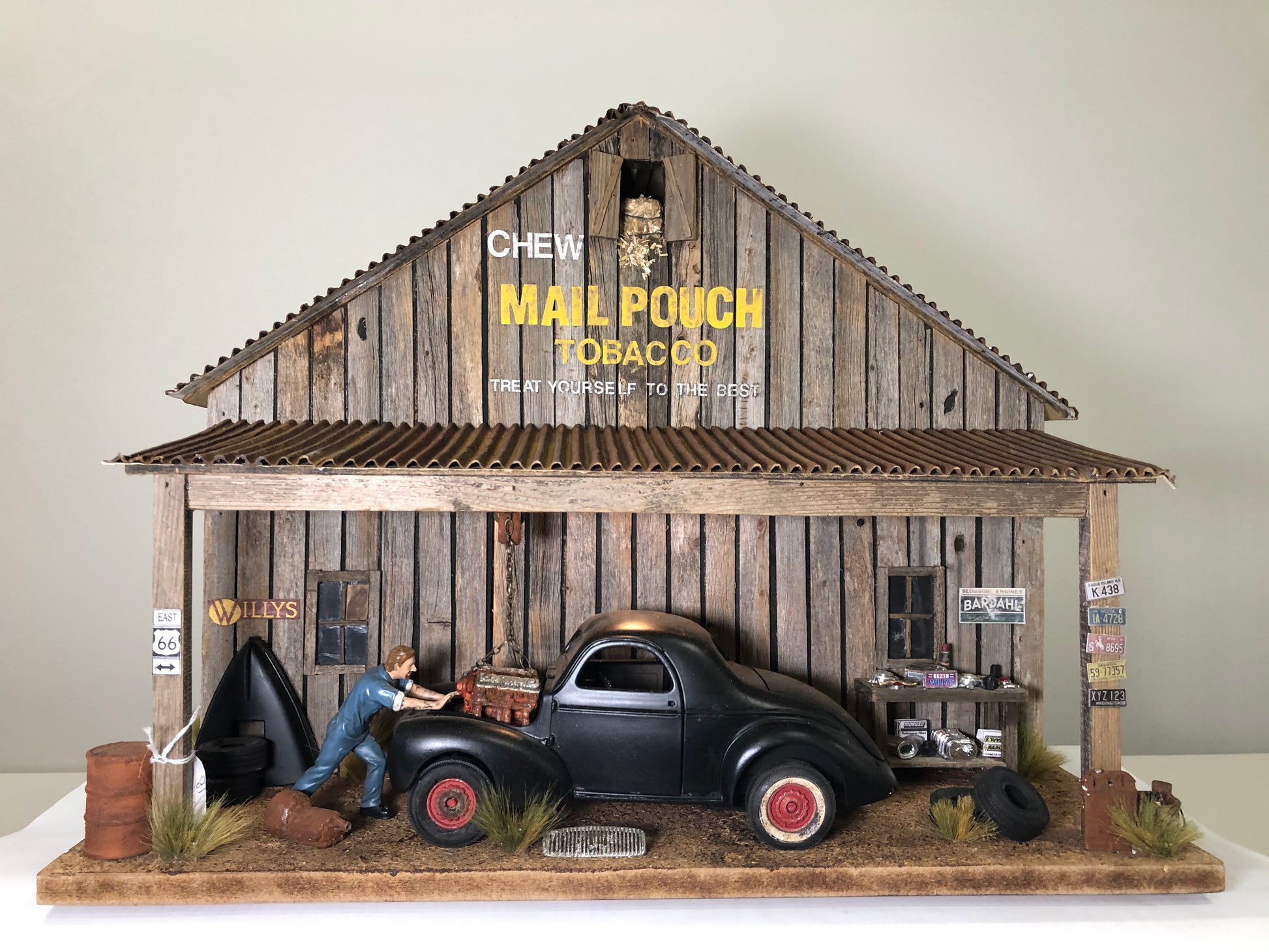 Handcrafted diorama using weathered wood for a more realistic appearance, displaying a mechanic working on a 1941 Willys coupe with spare parts, vintage signage, and license plates. Perfect for 1:18 scale diecast cars.