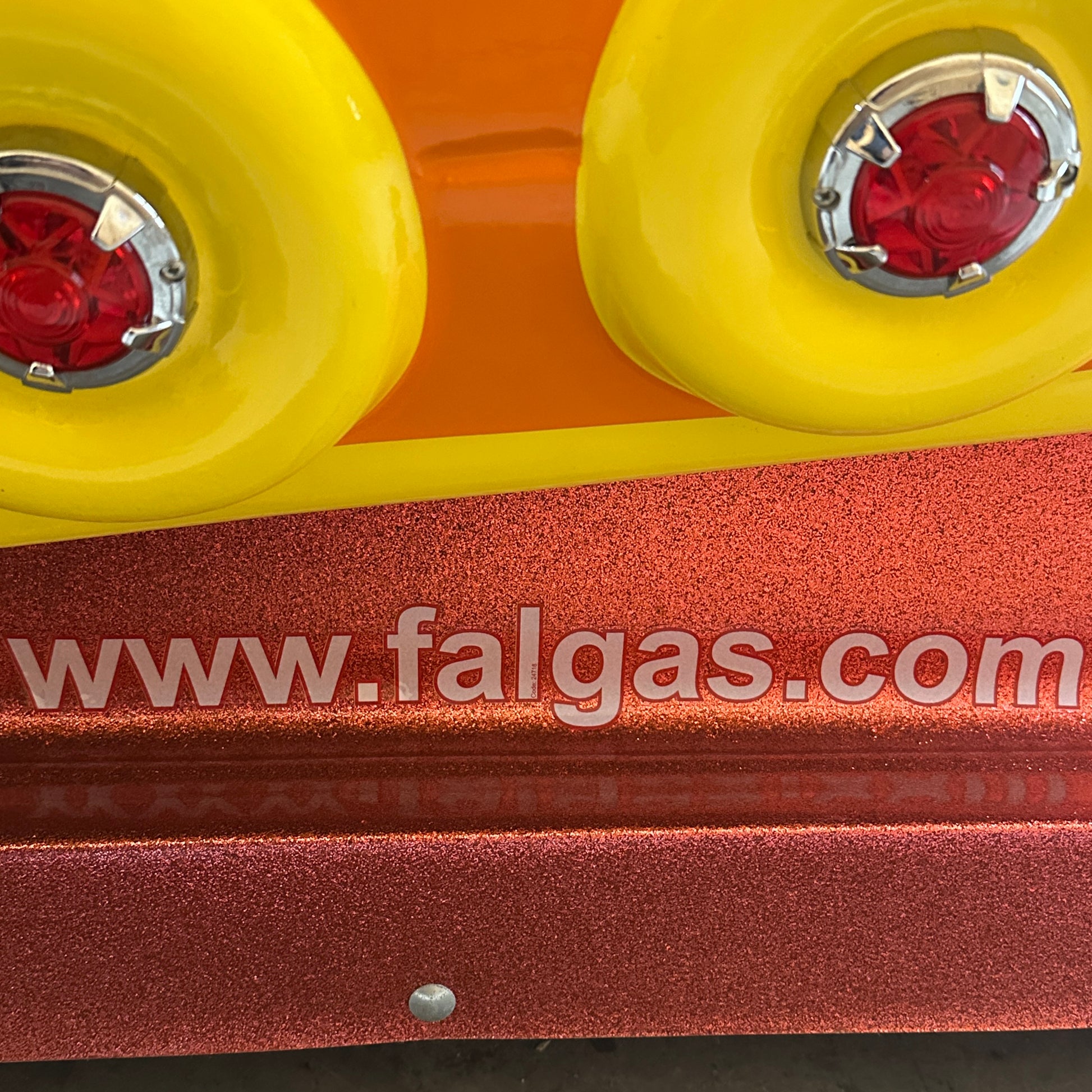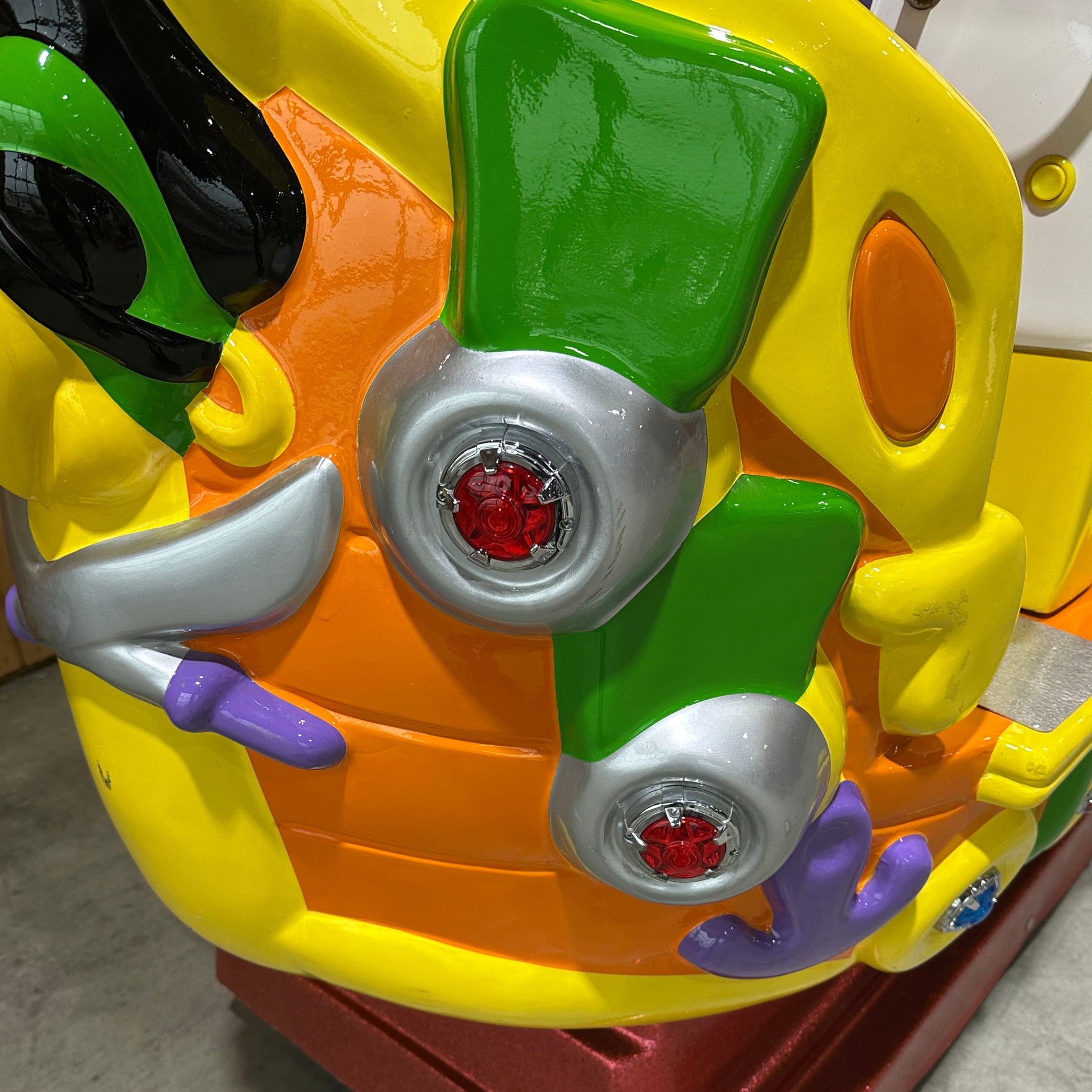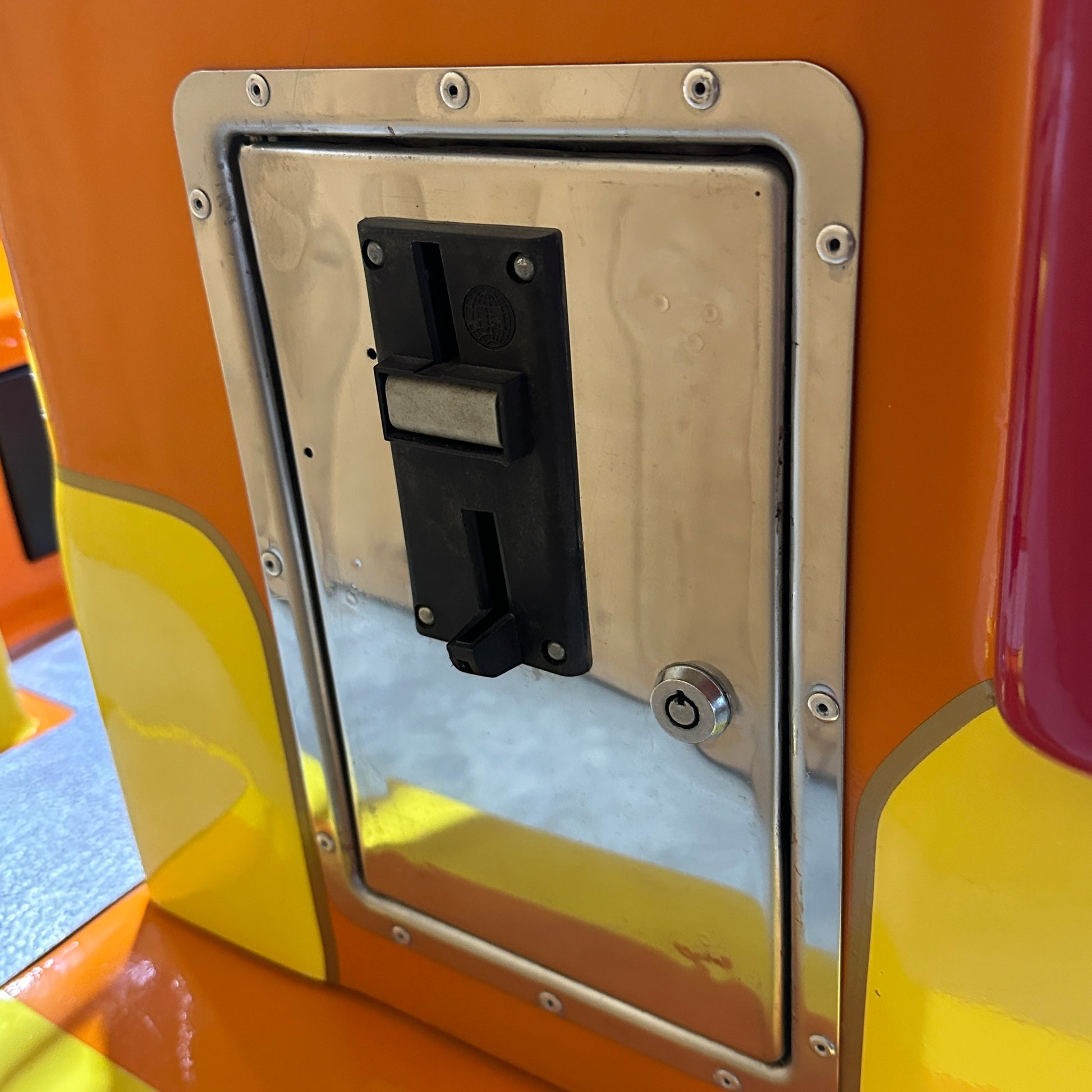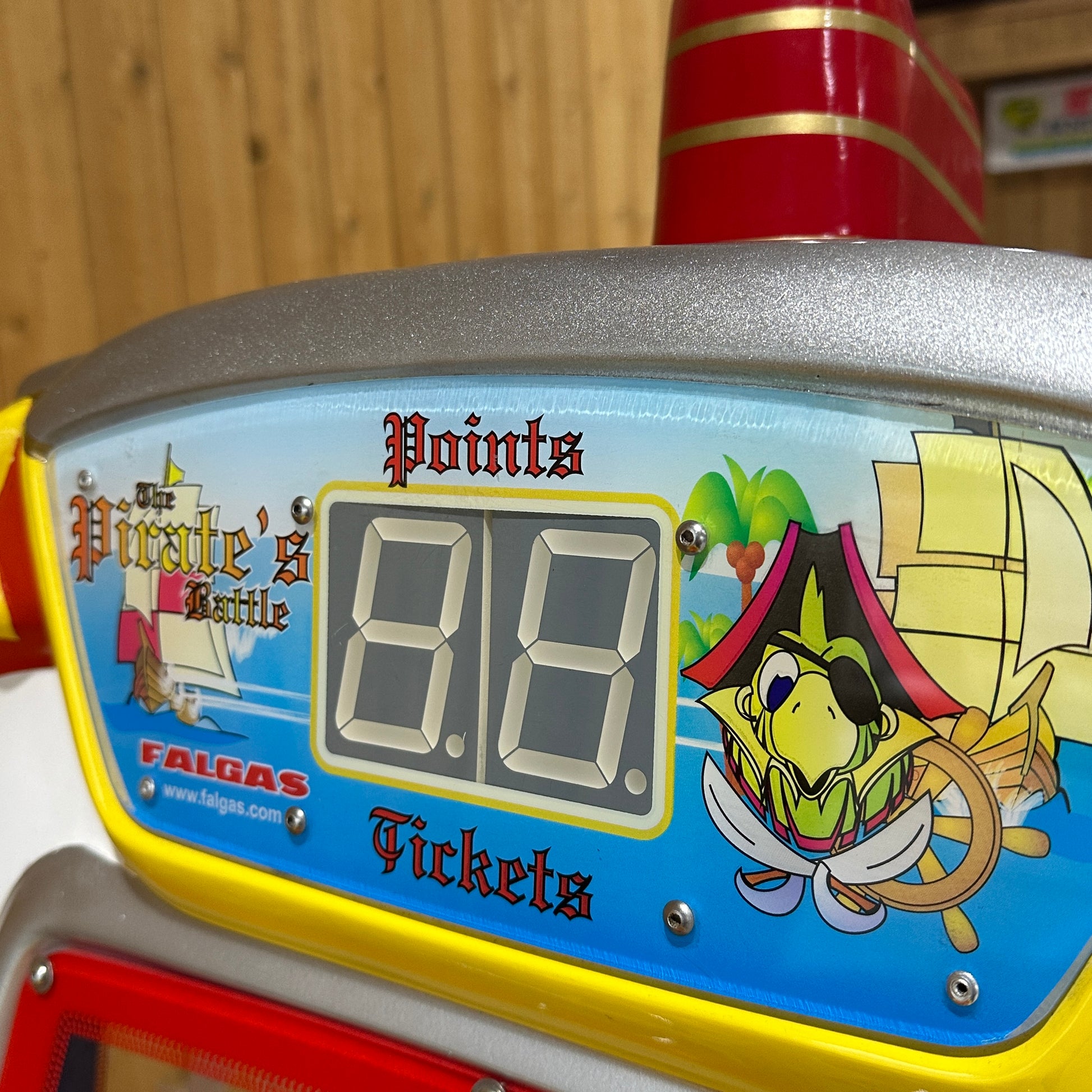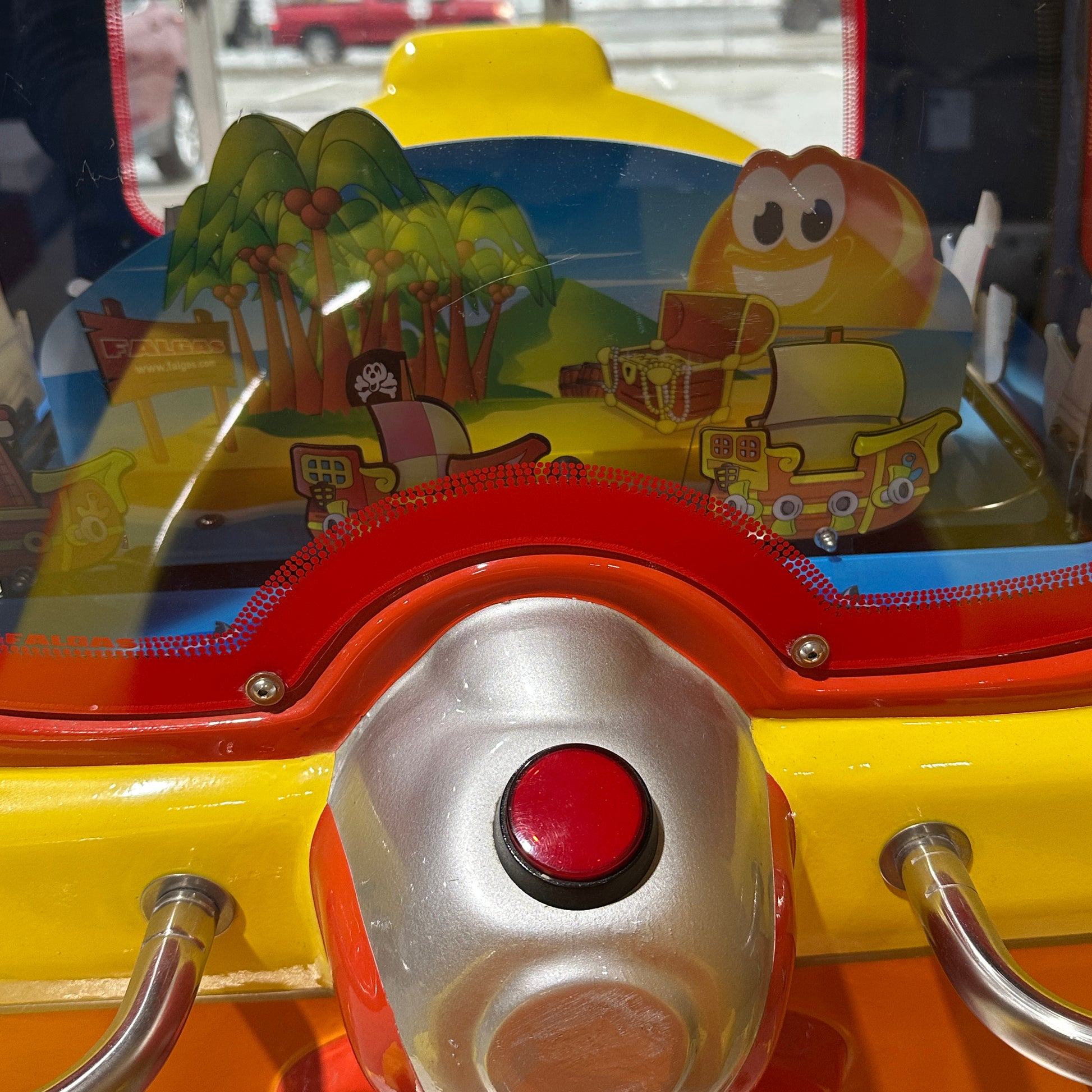 This genuine Falgas amusement ride is also a shooting gallery game for its two riders. The ship mimics wave motion and plays whimsical music when operating. LED lights illuminate when idle. “Gold” treasure coin tokens come with it. This ride has a vintage vibe but was sold new in 2014. Excellent condition.