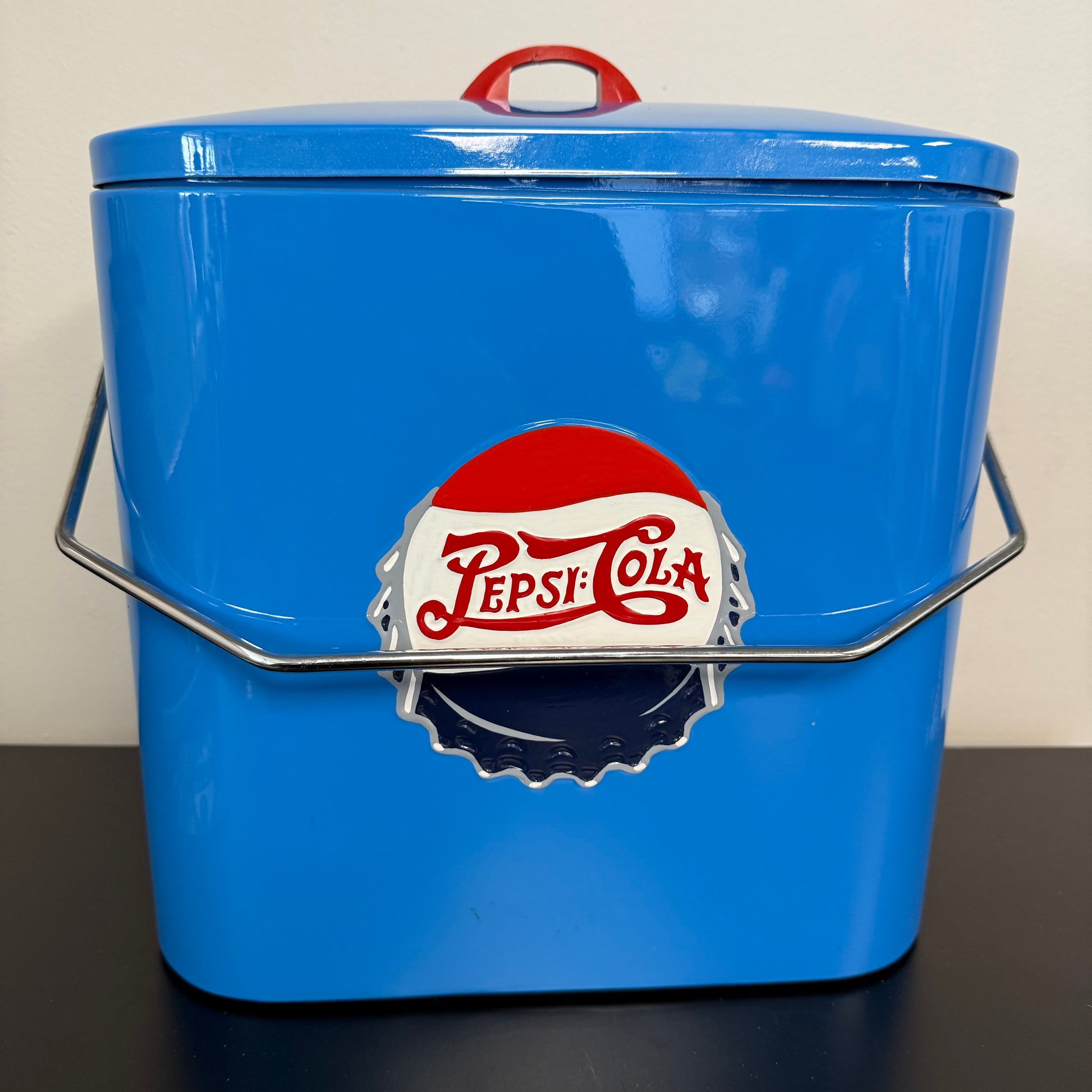 Original 1960's Pepsi-Cola Carry along cooler. Item has been restored in 1960's period style single stage paint. Restoration was completed a few years back. Cooler still presents itself very nice, has a few minor nicks in finish from being on display. Carry handle has been polished. Red handle on cooler lid has small crack as shown in pictures.