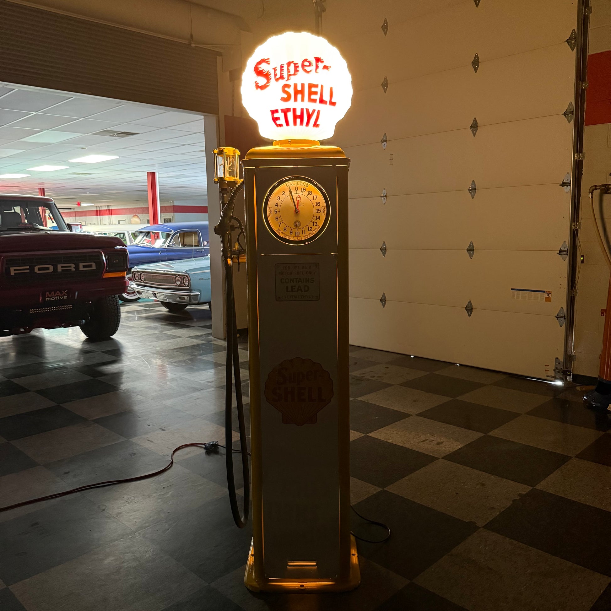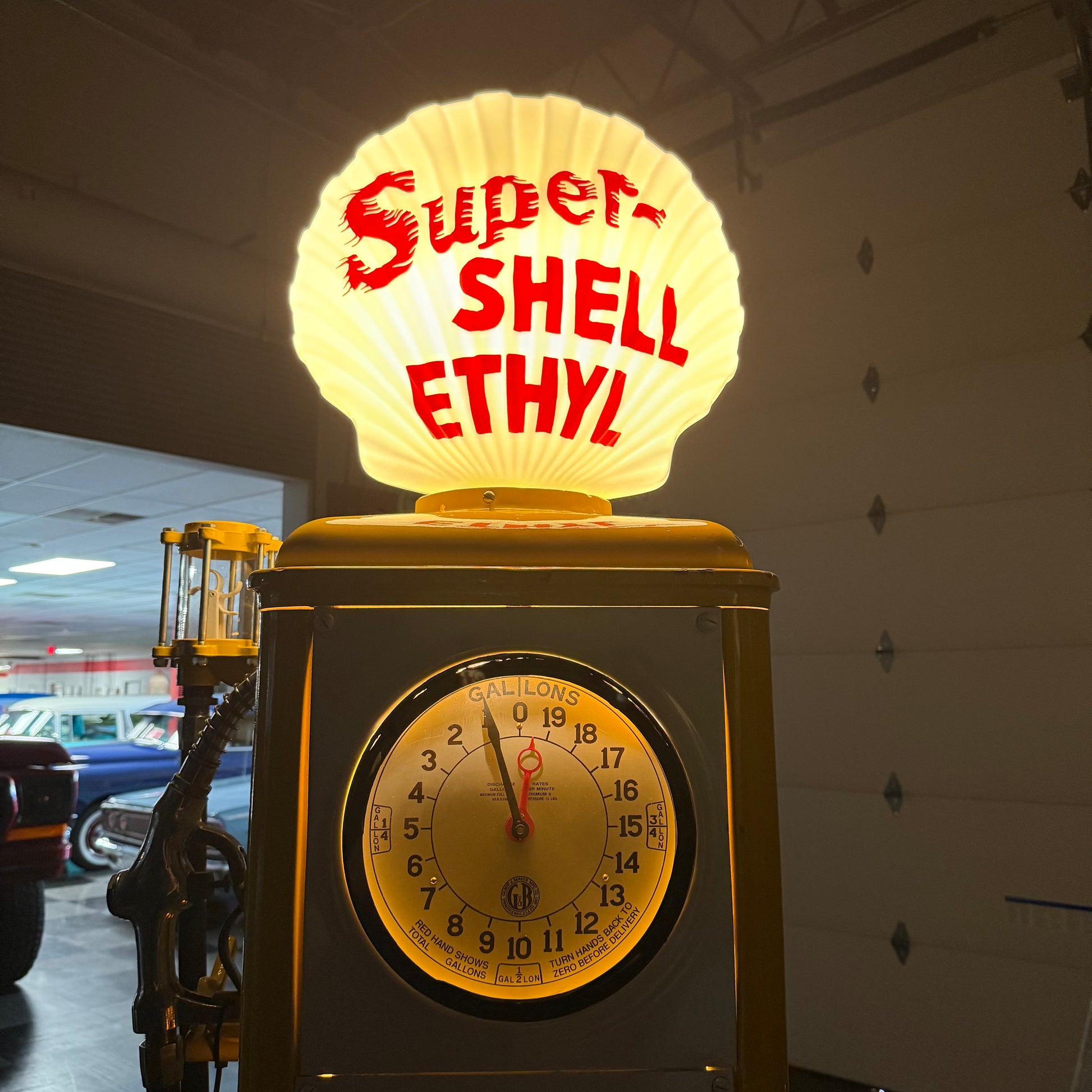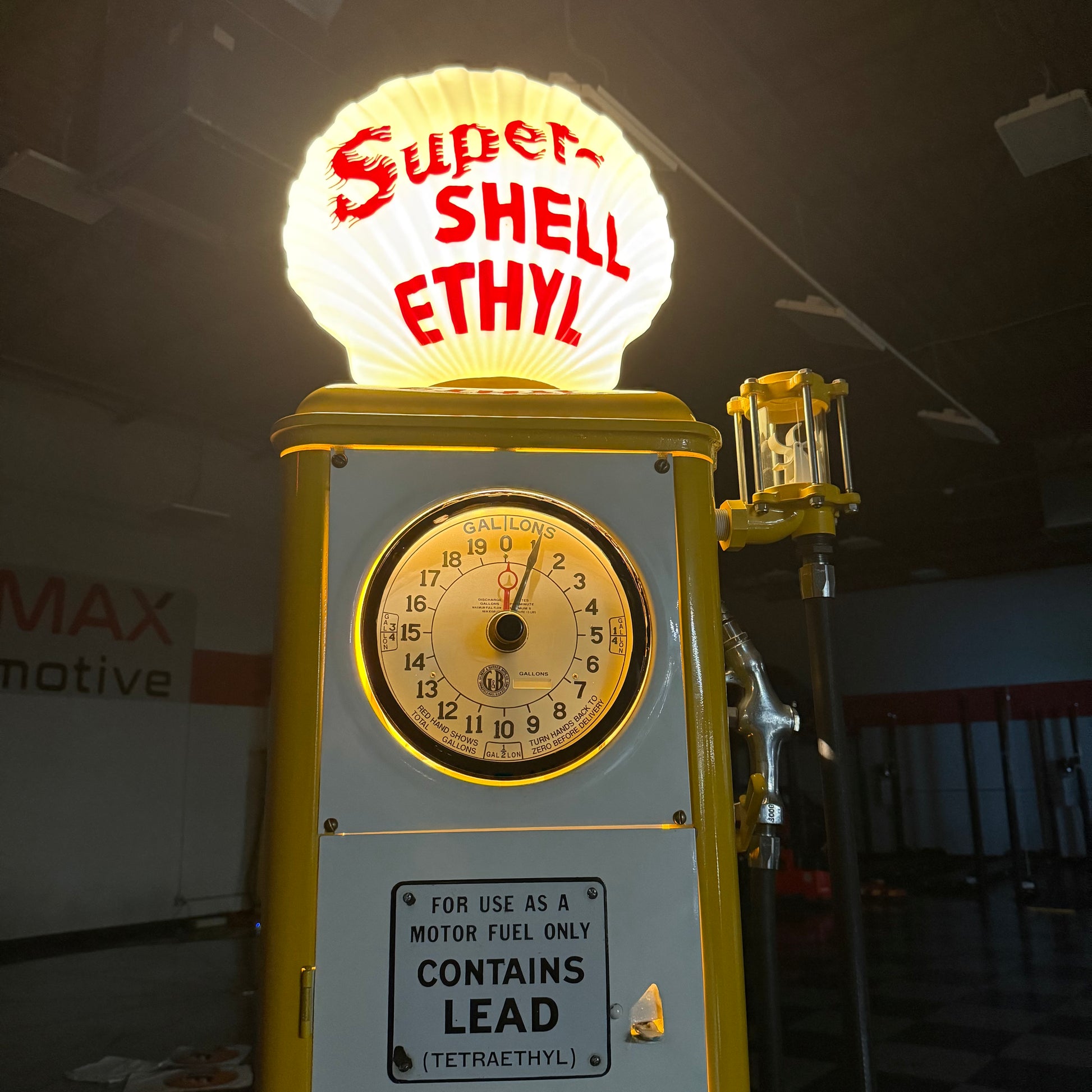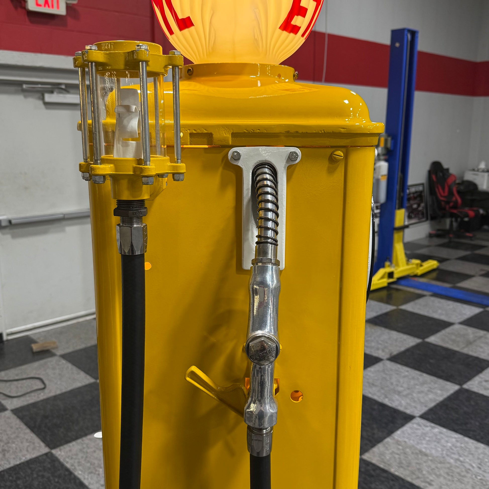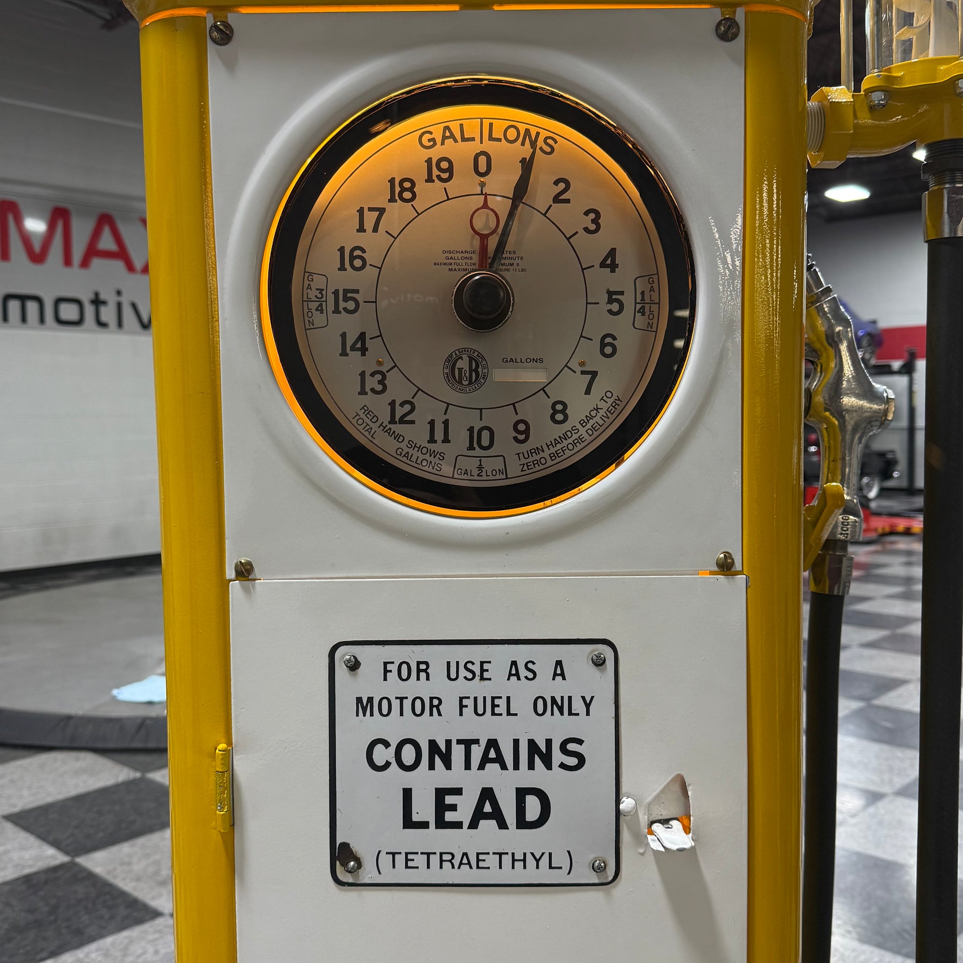 Maxmotive is pumped (come on, just makes sense) to offer this restored Gilbert & Barker 105 Clock face gas pump. This beauty, and I mean beauty of an antique is ready for her new home. She has been on display in our dealership for the past 6 years, and has some marks in the paint as shown from being moved to shows. The vinyl decal applied during restoration has scratches in it as pictured on one side. The top of the "shell" is glass. The handle is a Buckeye 800F. The base of the pump has Made in USA, stamped "F". The serial number is pictured, but as you can see the paint has filled the serial numbers over. The Gilbert & Barker clock face pump is one of the most sought after, and tough to find vintage pumps out there. The one LED bulb is on when plugged in, and off when unplugged.