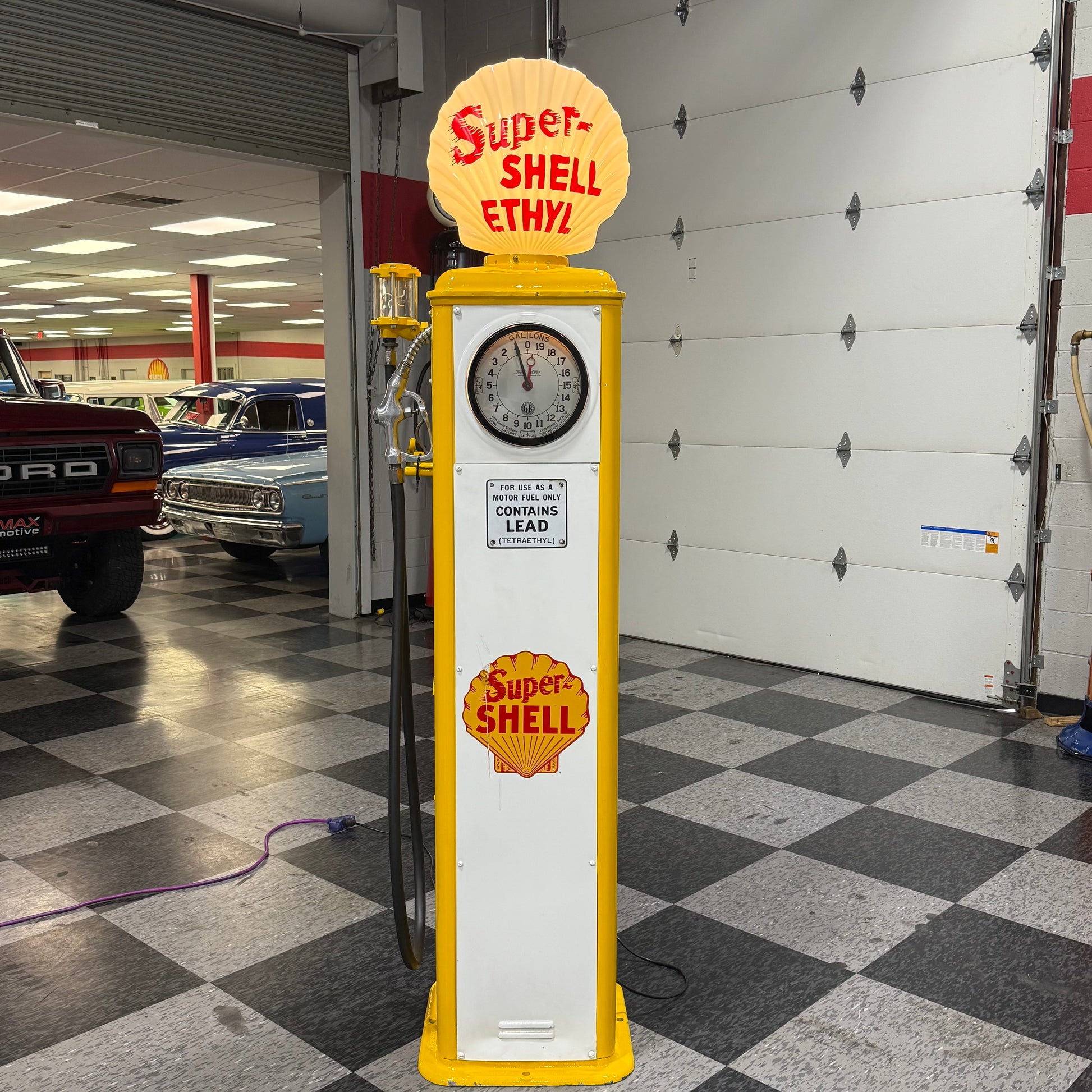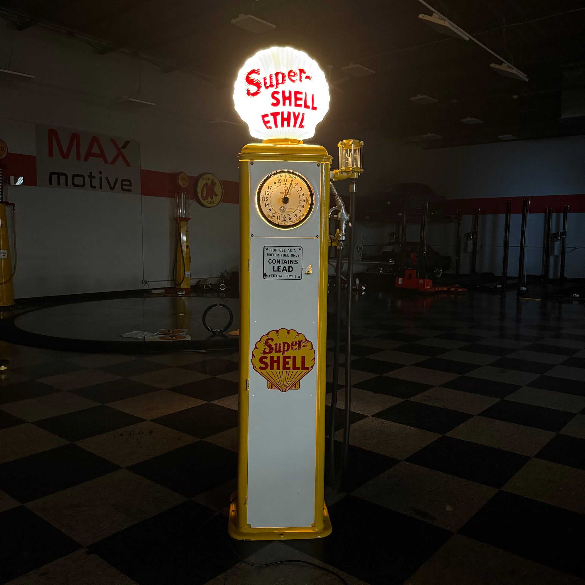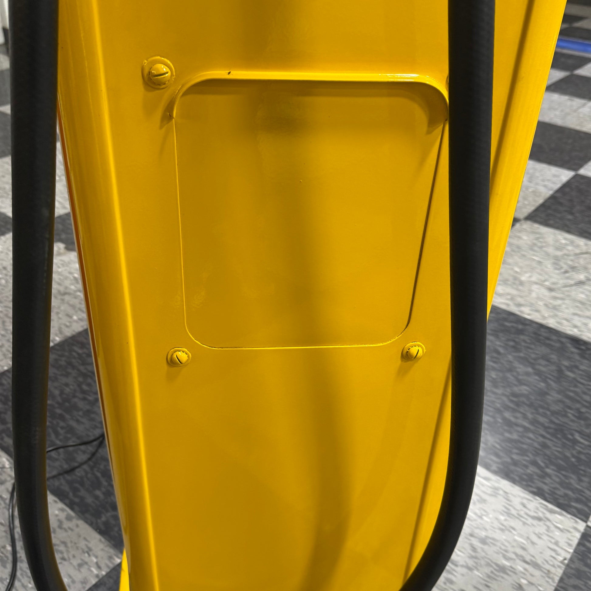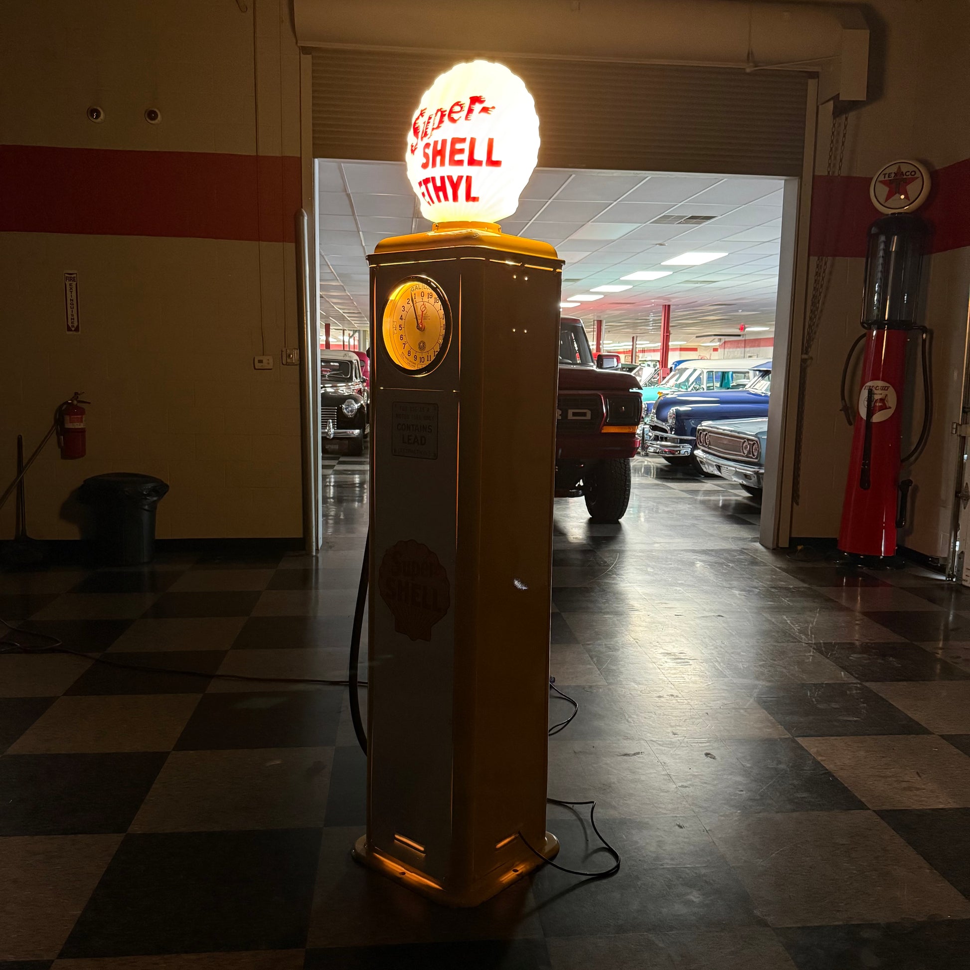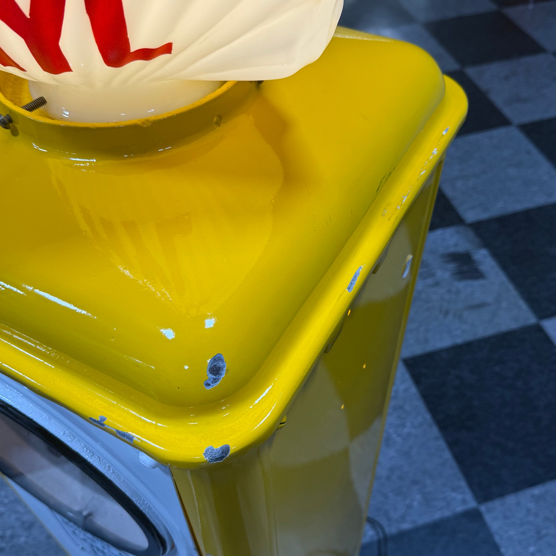 Maxmotive is pumped (come on, just makes sense) to offer this restored Gilbert & Barker 105 Clock face gas pump. This beauty, and I mean beauty of an antique is ready for her new home. She has been on display in our dealership for the past 6 years, and has some marks in the paint as shown from being moved to shows. The vinyl decal applied during restoration has scratches in it as pictured on one side. The top of the "shell" is glass. The handle is a Buckeye 800F. The base of the pump has Made in USA, stamped "F". The serial number is pictured, but as you can see the paint has filled the serial numbers over. The Gilbert & Barker clock face pump is one of the most sought after, and tough to find vintage pumps out there. The one LED bulb is on when plugged in, and off when unplugged.