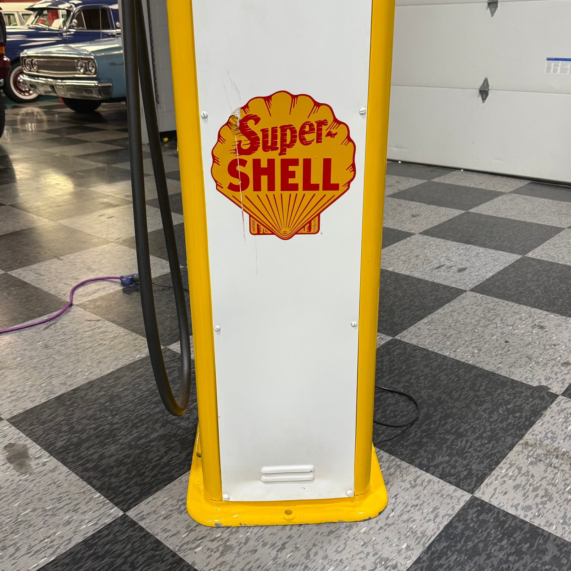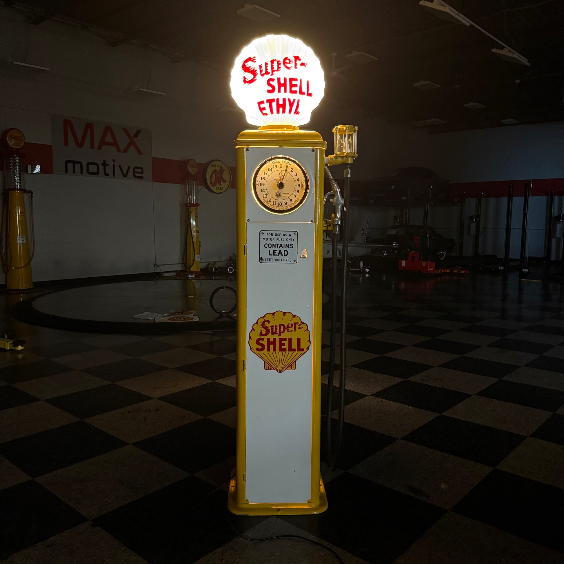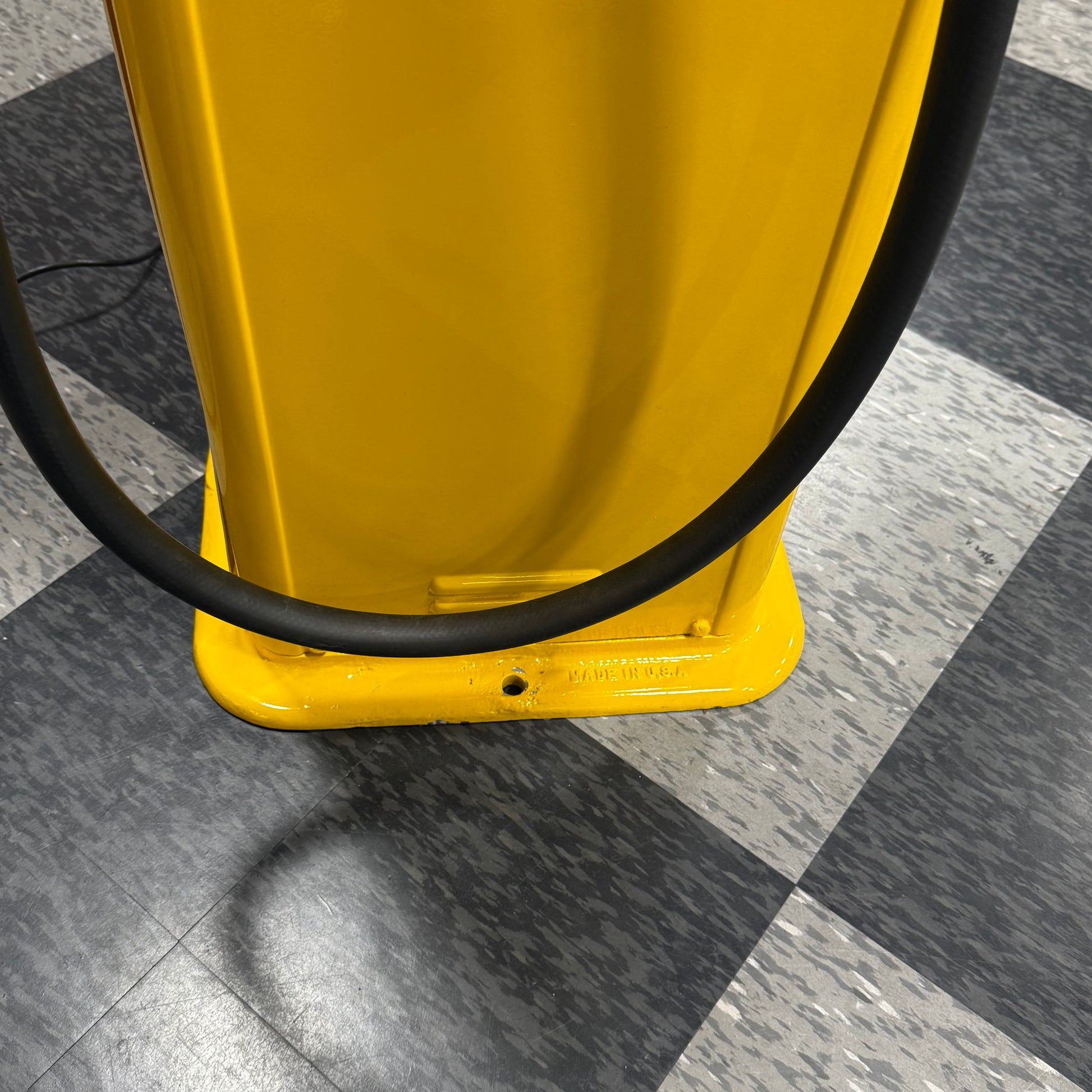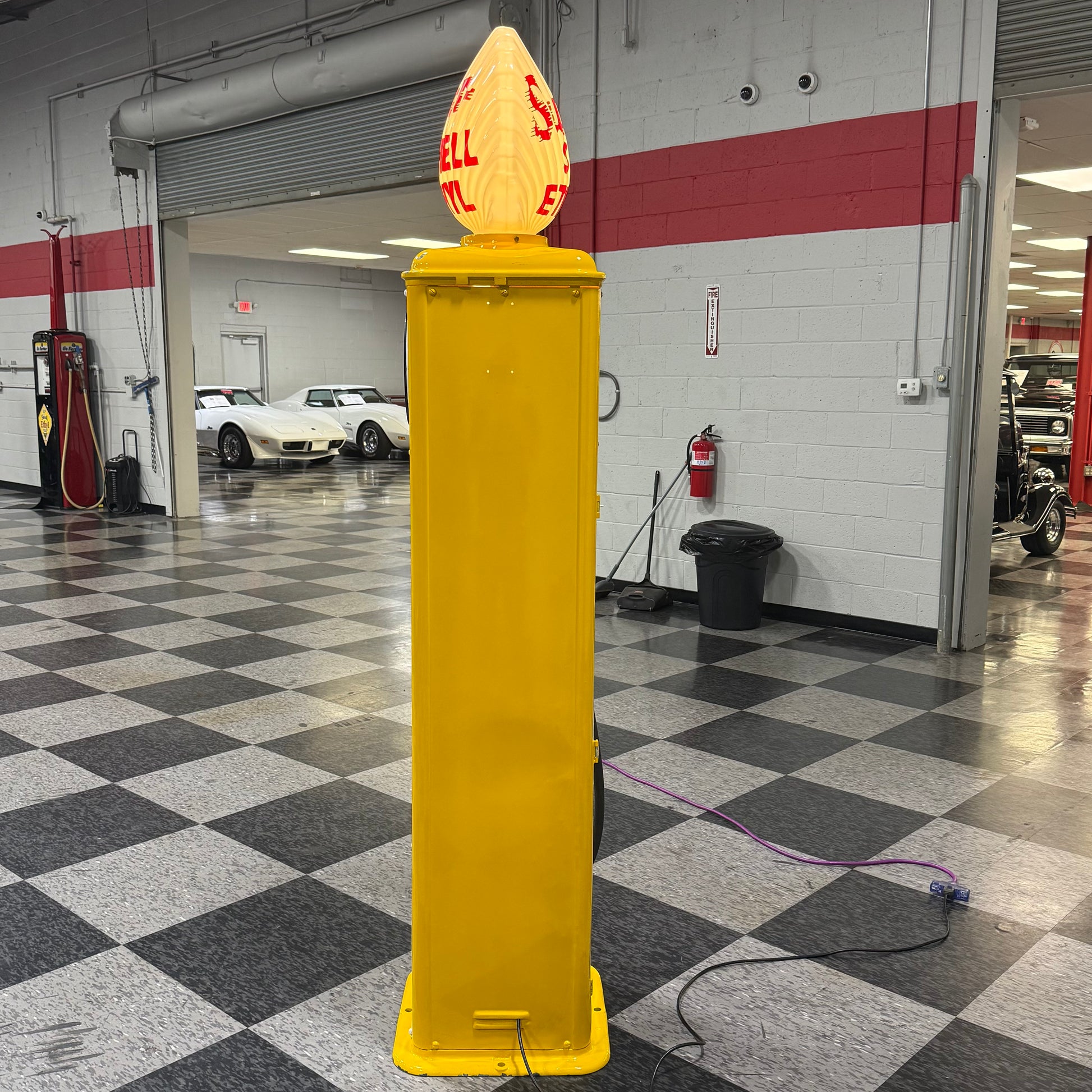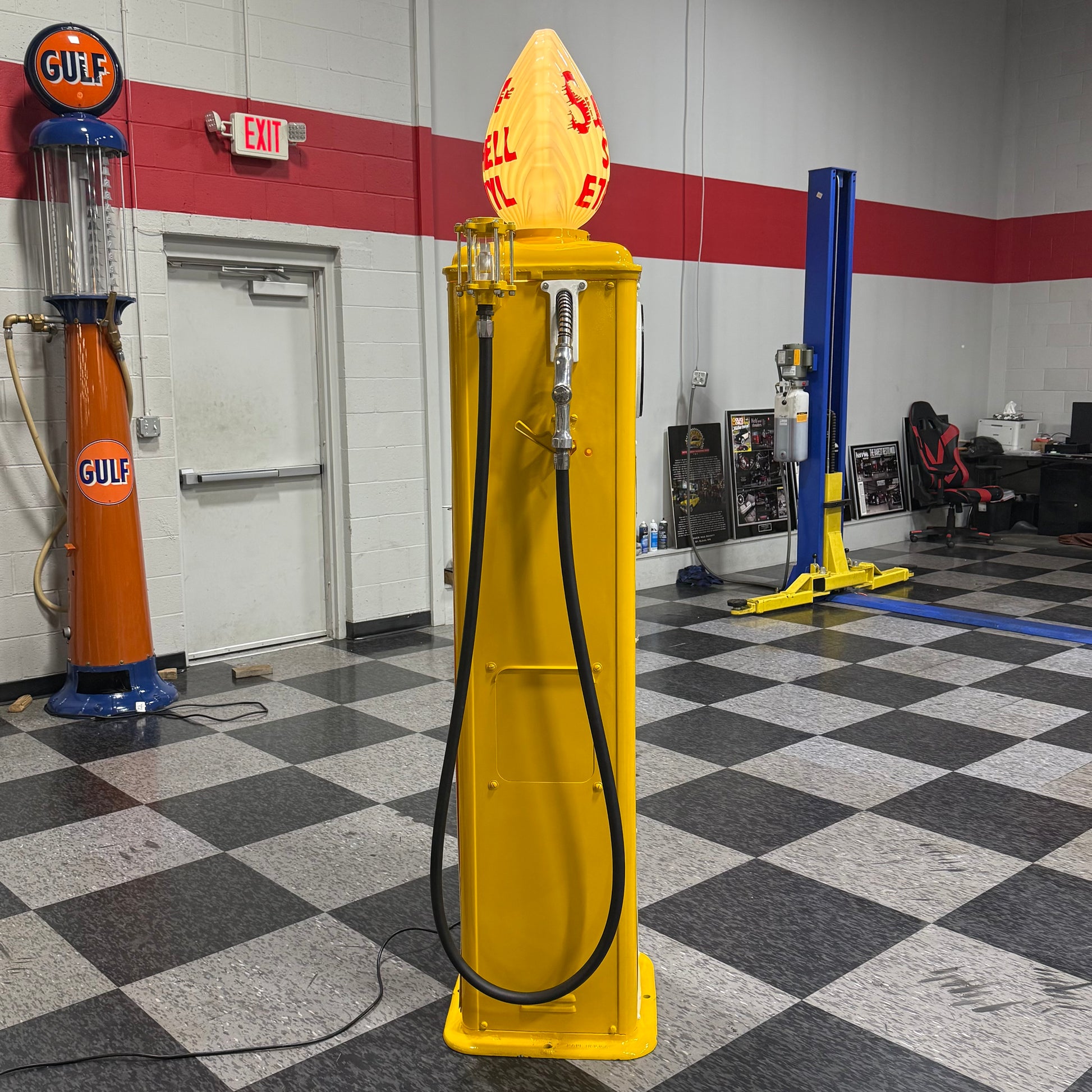 Maxmotive is pumped (come on, just makes sense) to offer this restored Gilbert & Barker 105 Clock face gas pump. This beauty, and I mean beauty of an antique is ready for her new home. She has been on display in our dealership for the past 6 years, and has some marks in the paint as shown from being moved to shows. The vinyl decal applied during restoration has scratches in it as pictured on one side. The top of the "shell" is glass. The handle is a Buckeye 800F. The base of the pump has Made in USA, stamped "F". The serial number is pictured, but as you can see the paint has filled the serial numbers over. The Gilbert & Barker clock face pump is one of the most sought after, and tough to find vintage pumps out there. The one LED bulb is on when plugged in, and off when unplugged.