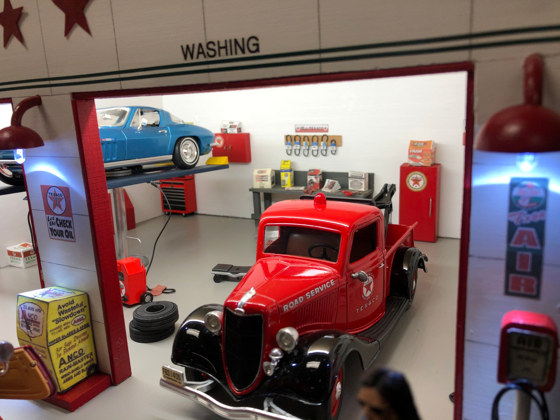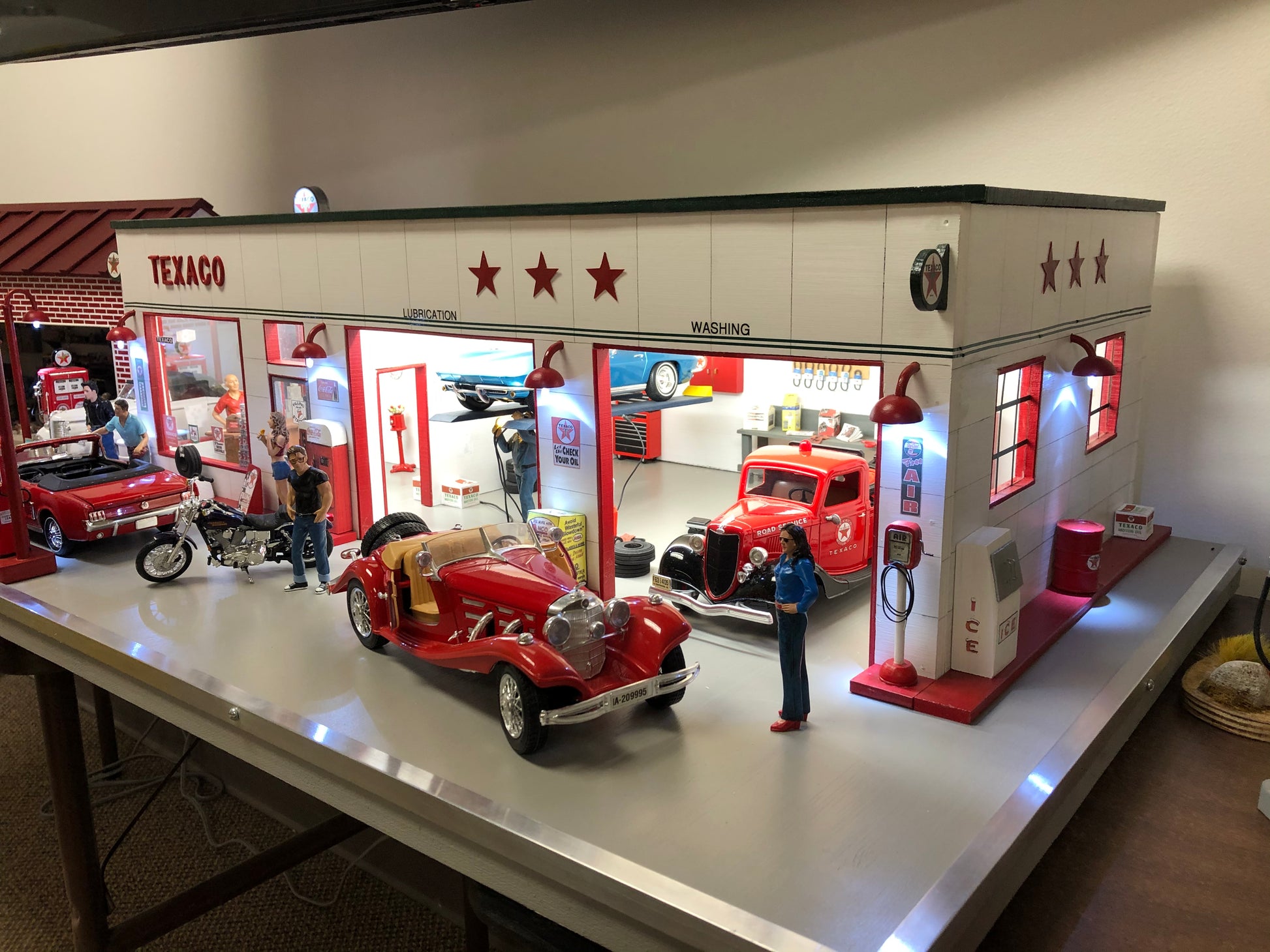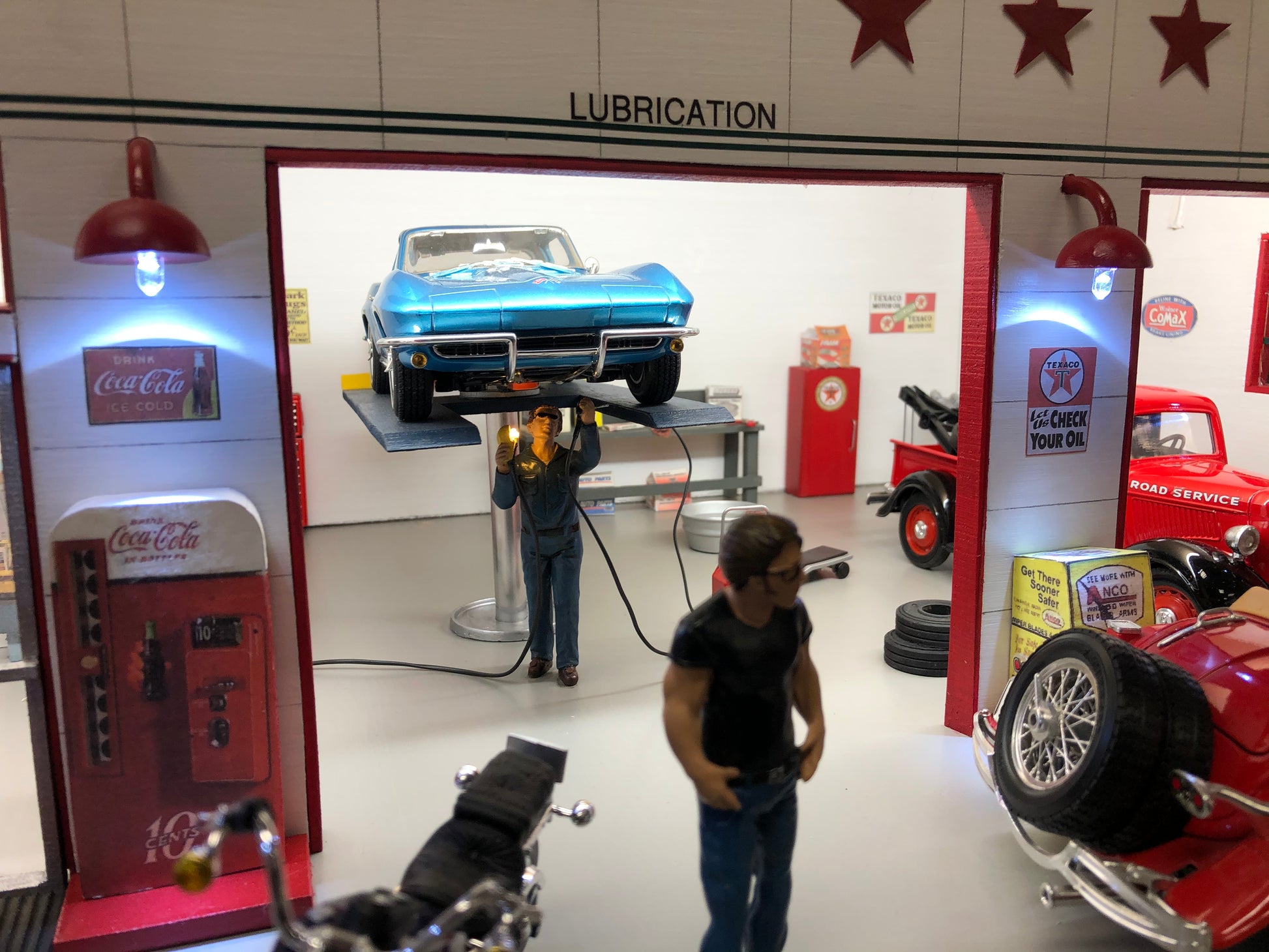Truly a beautiful handcrafted 1:18 scale gas station featuring many details found in a vintage gas station. Look closely at the details, interior and exterior lighting, vintage gas pump islands, ice chest, oil drums, store with cashier and even a mechanic working on a car under a lift. There are so many incredible details, you must see for yourself. This piece includes all that is pictured including the 1:18 scale diecasts.