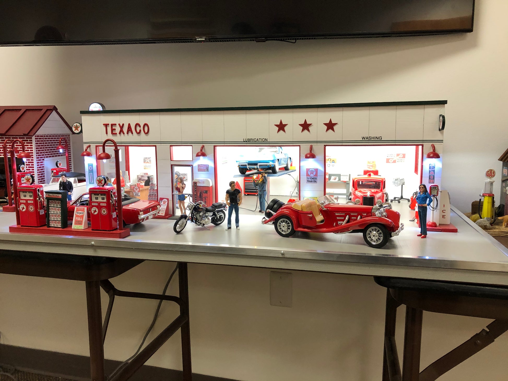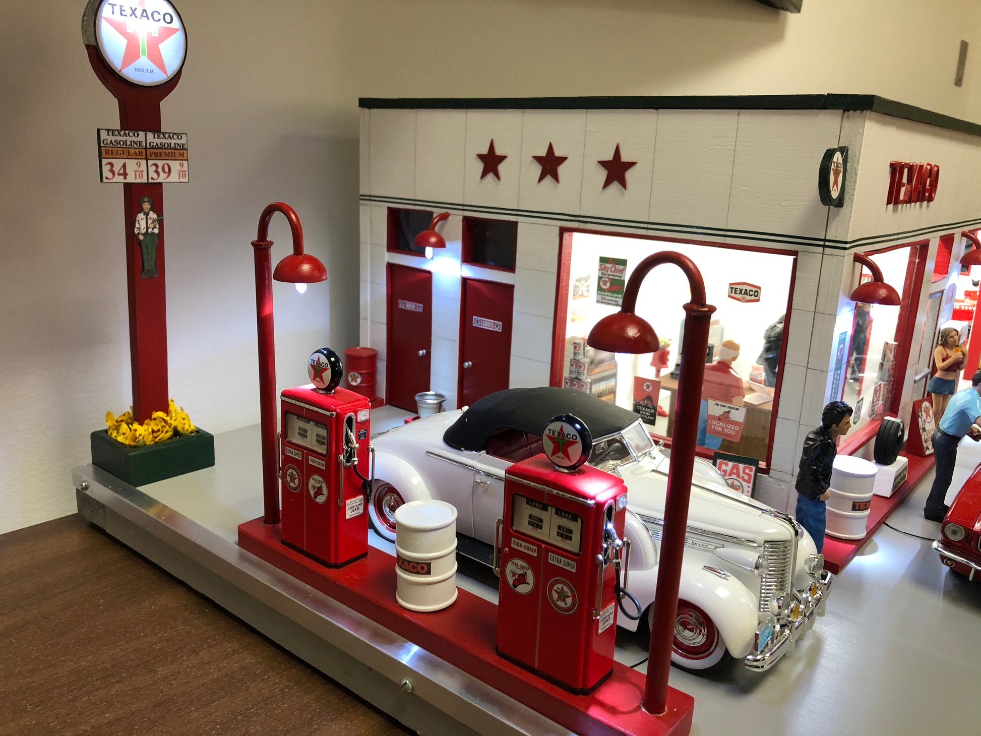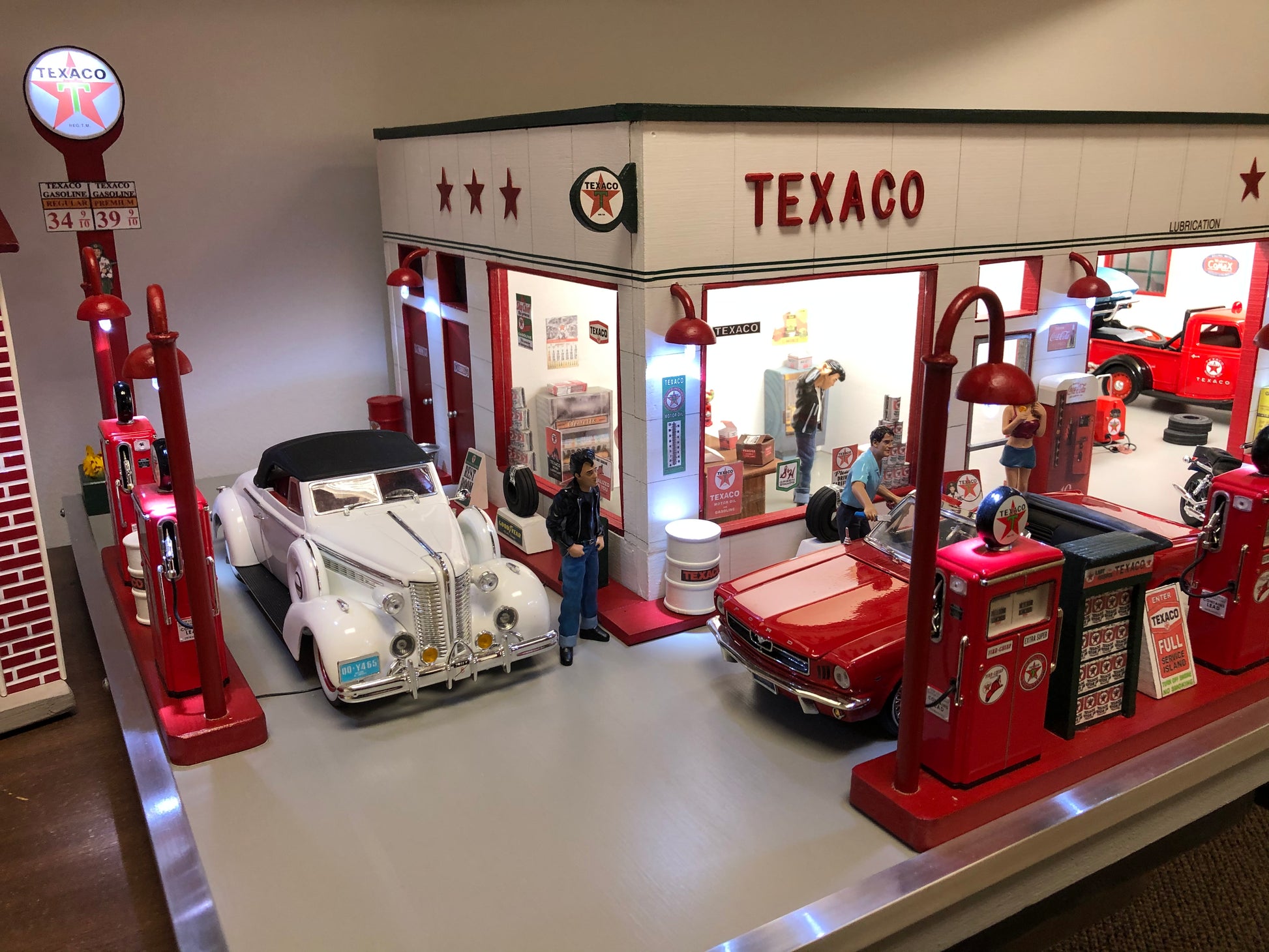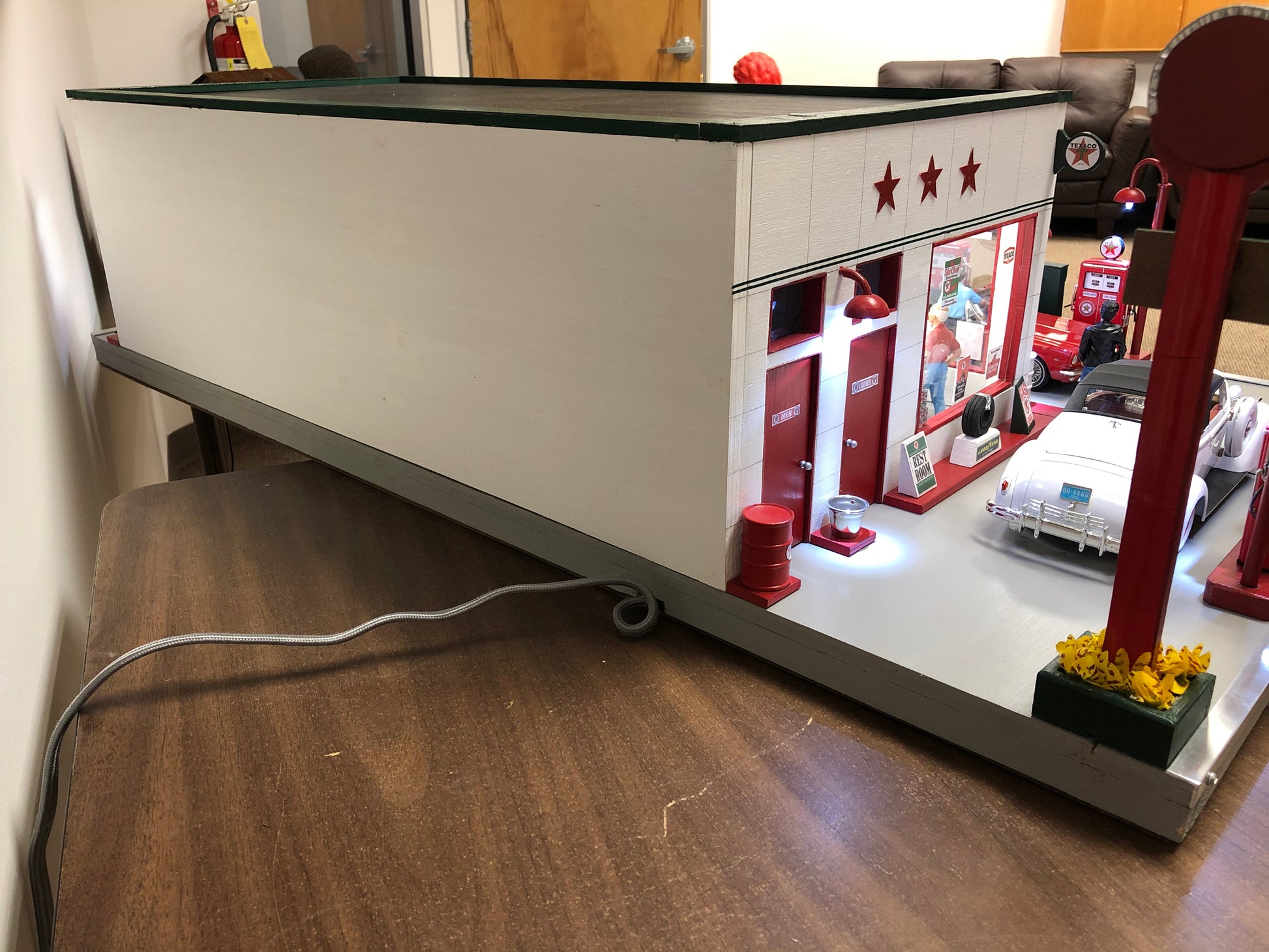 Truly a beautiful handcrafted 1:18 scale gas station featuring many details found in a vintage gas station. Look closely at the details, interior and exterior lighting, vintage gas pump islands, ice chest, oil drums, store with cashier and even a mechanic working on a car under a lift. There are so many incredible details, you must see for yourself. This piece includes all that is pictured including the 1:18 scale diecasts.
