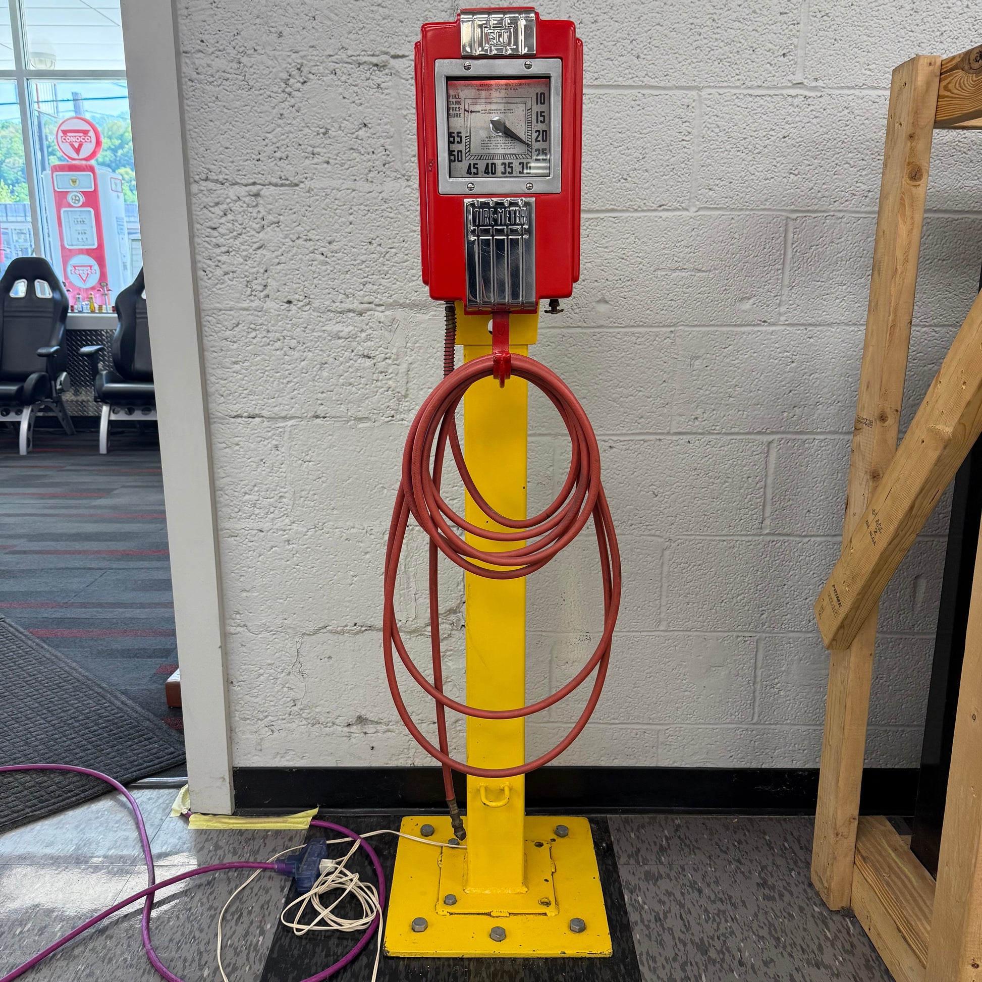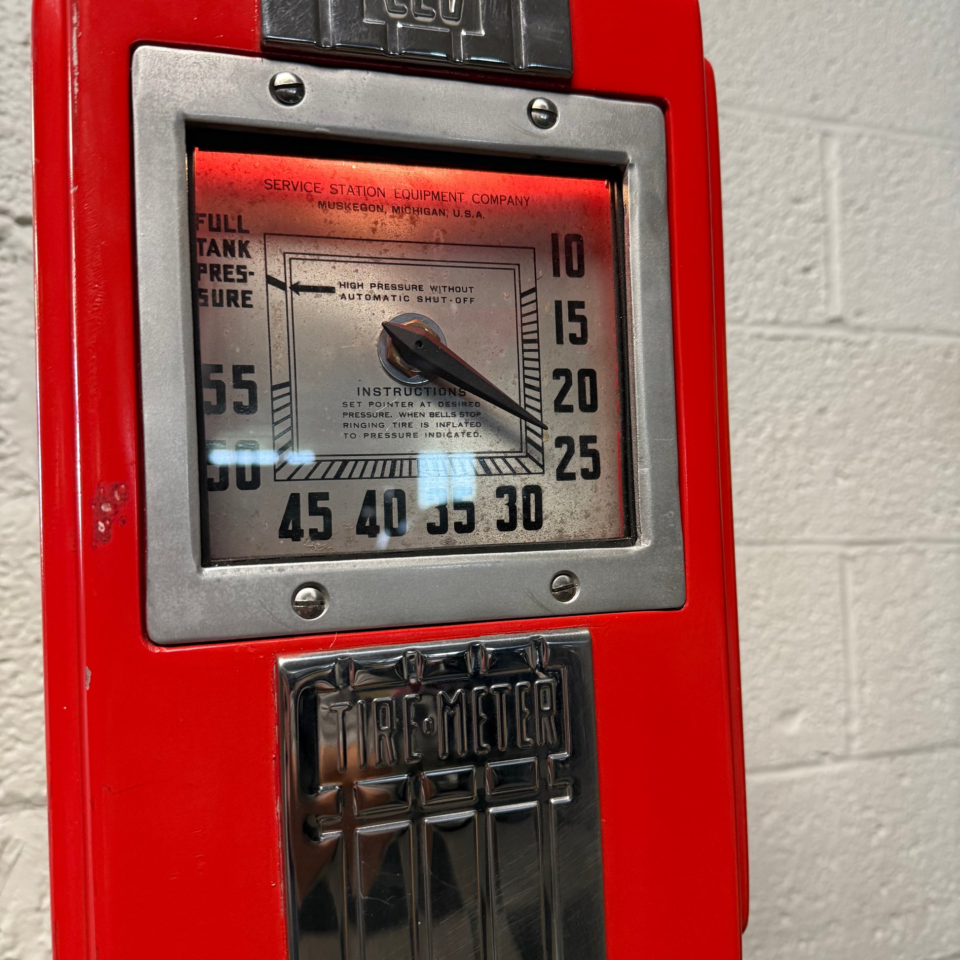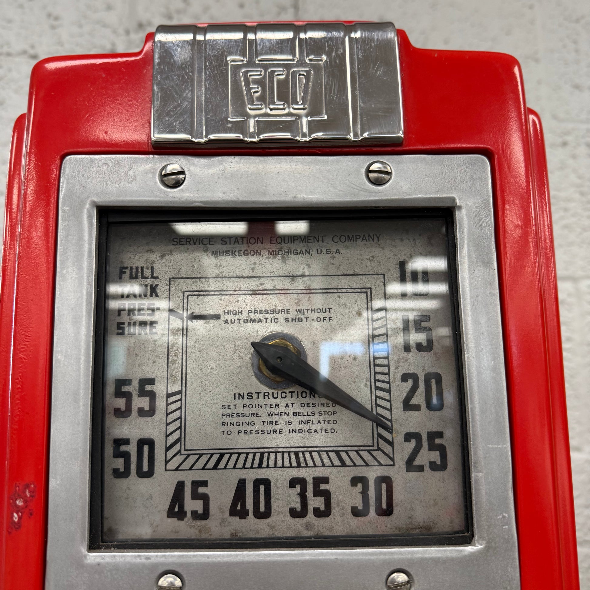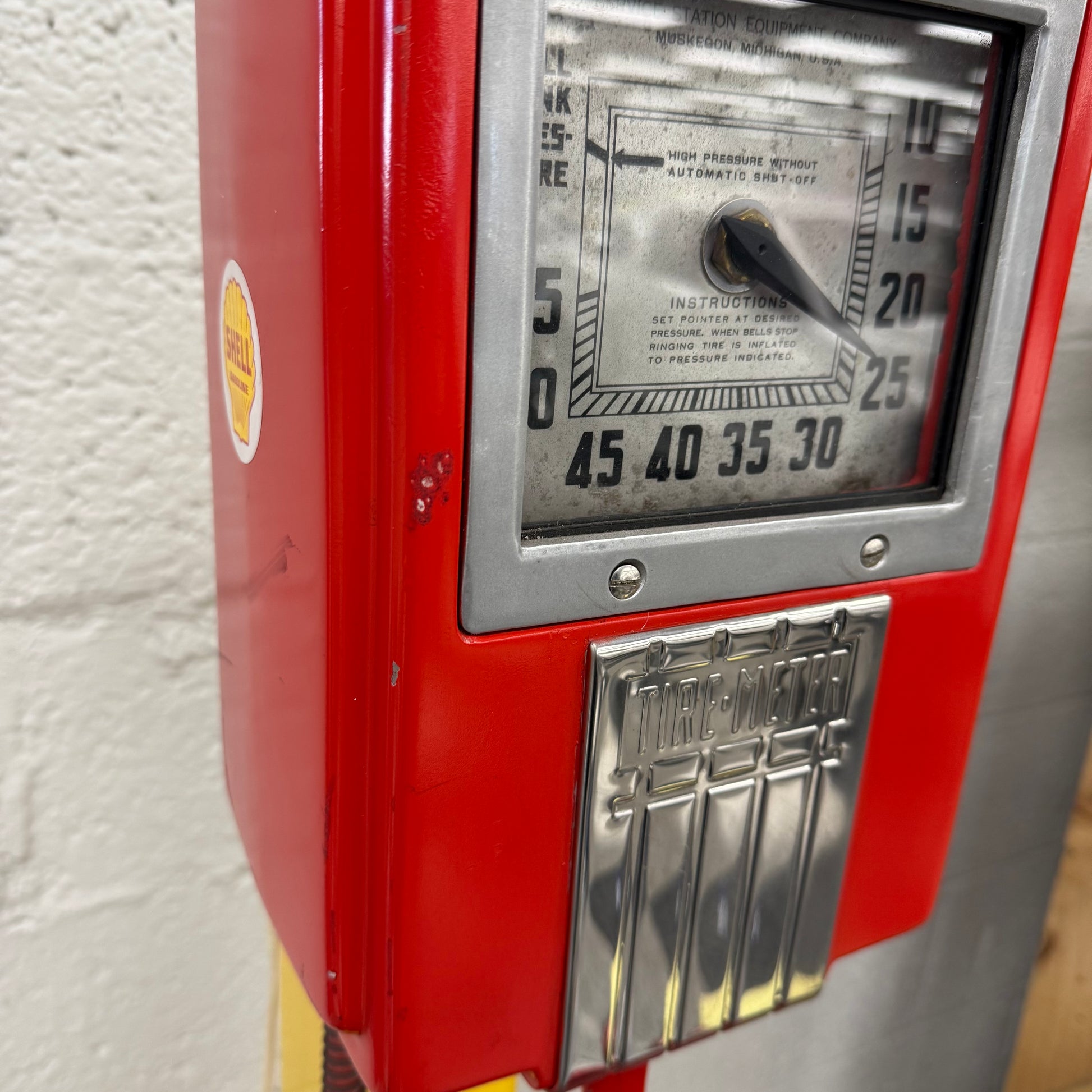 This vintage Eco tire Air Meter is for sale and looking for her new forever home! This Service Station equipment Company was based out of Muskegon Michigan U.S.A. This air meter was restored in a Shell color theme approximately 8 years ago. It has been on display in our dealership during that time. There are some scuffs and marks in the finish as pictured from being on display. The yellow paint on the base behind the red Eco tire meter has some paint peeling as shown. The Shell logo is a vinyl decal. It does light up as shown in the pictures. It has a standard two prong wiring connector as shown. The light turn ons on when plugged in, and turns off when unplugged. There is not a control switch for the light.