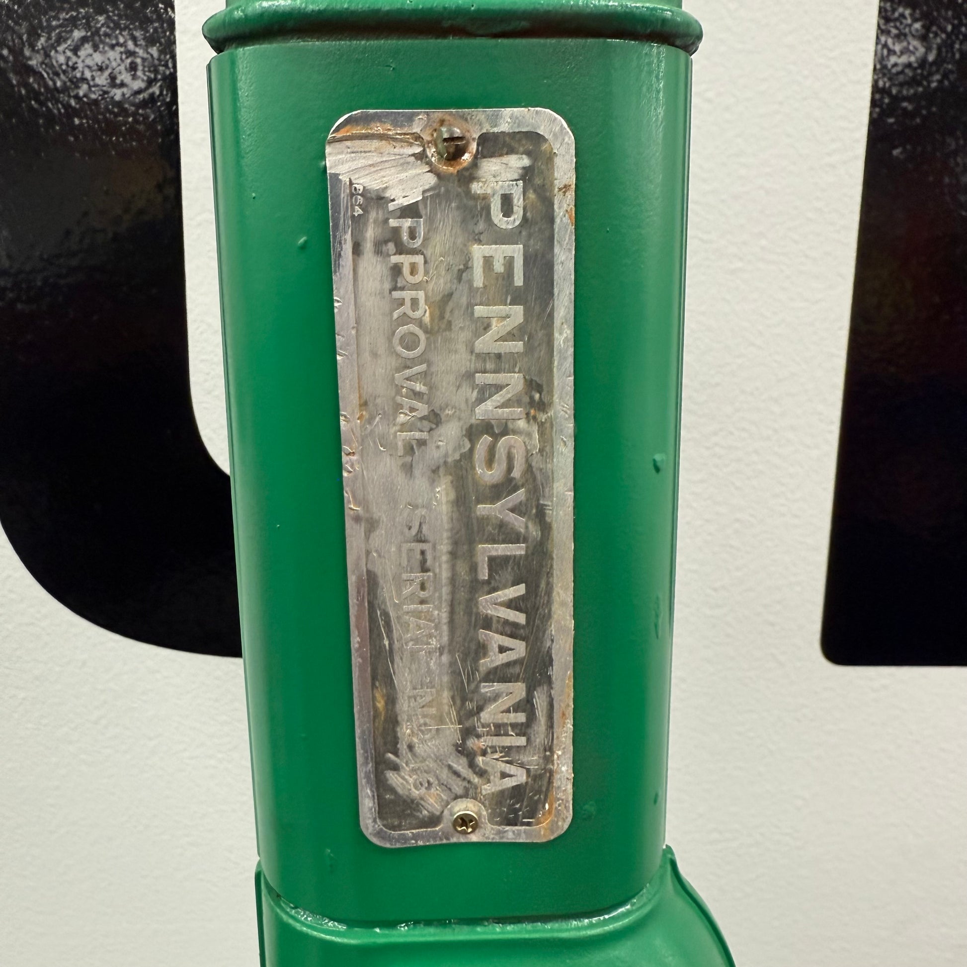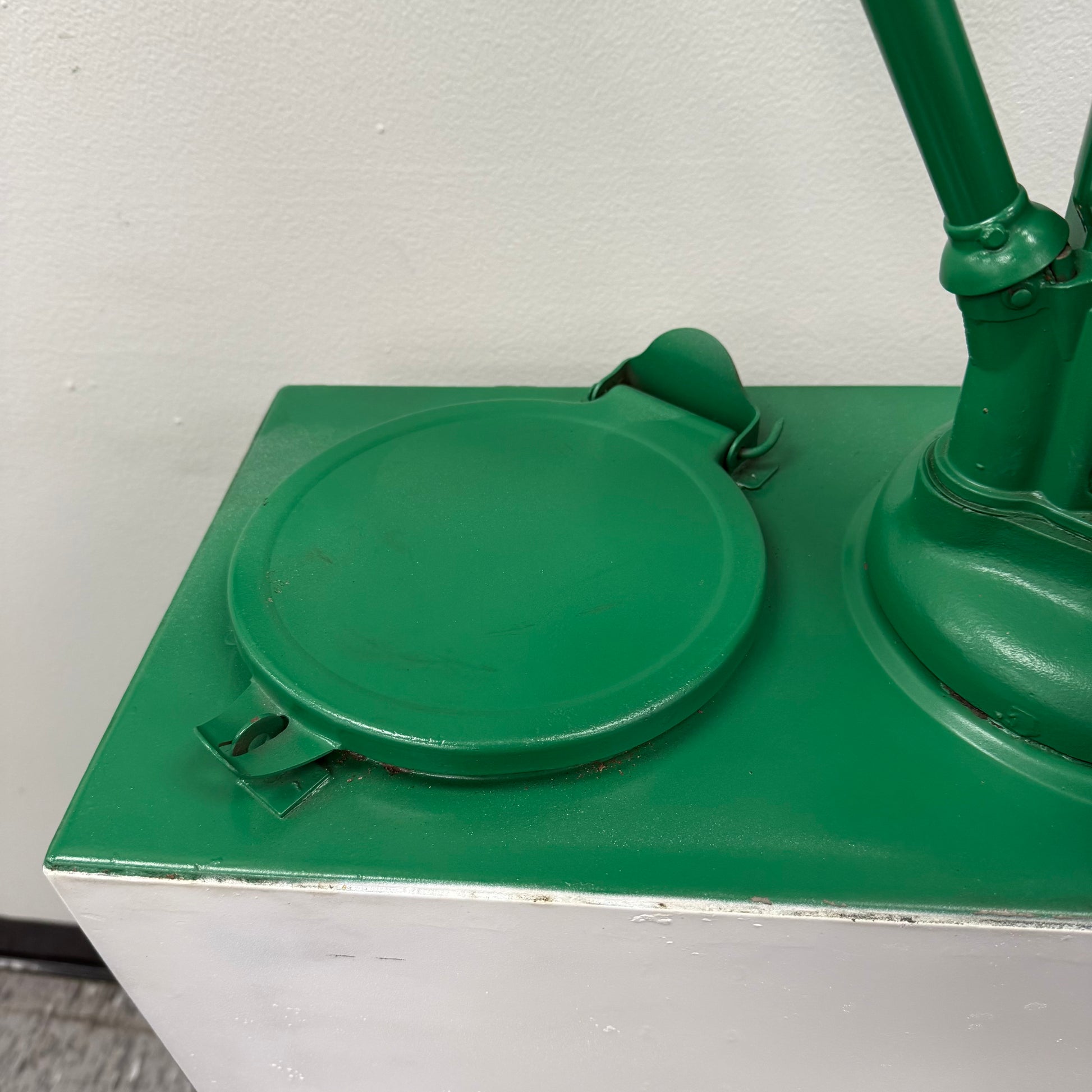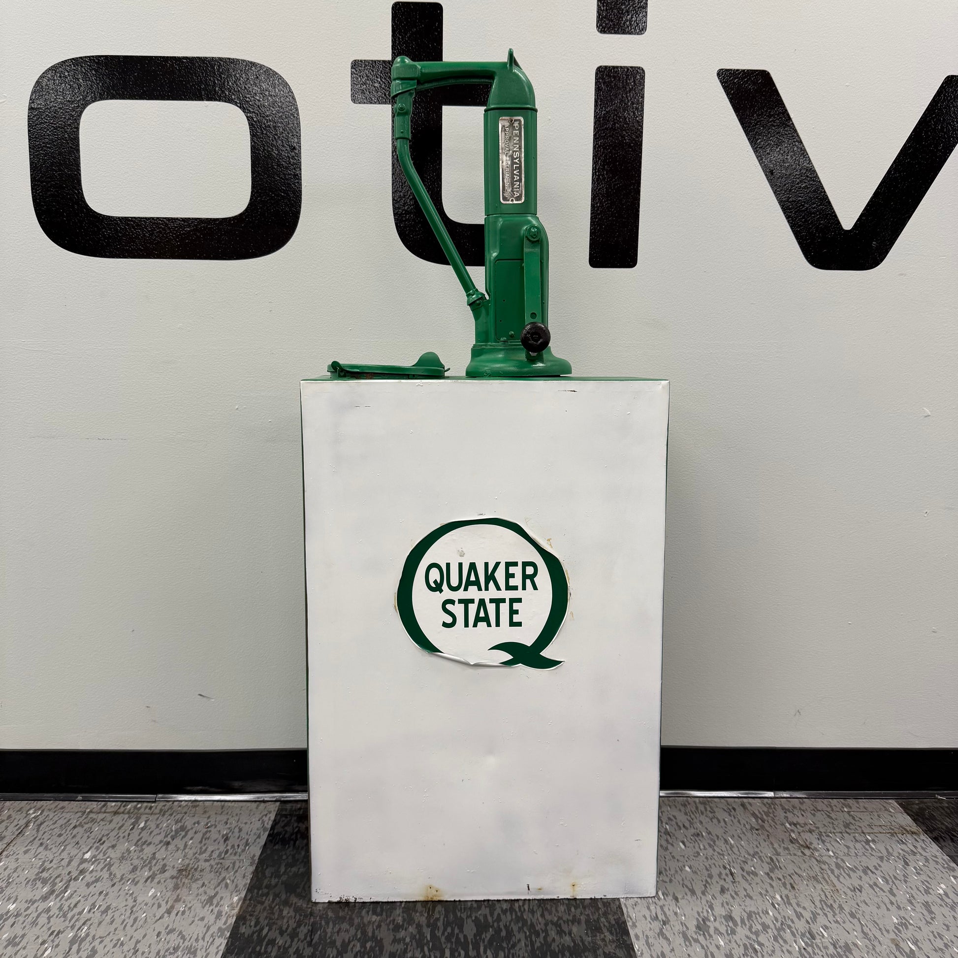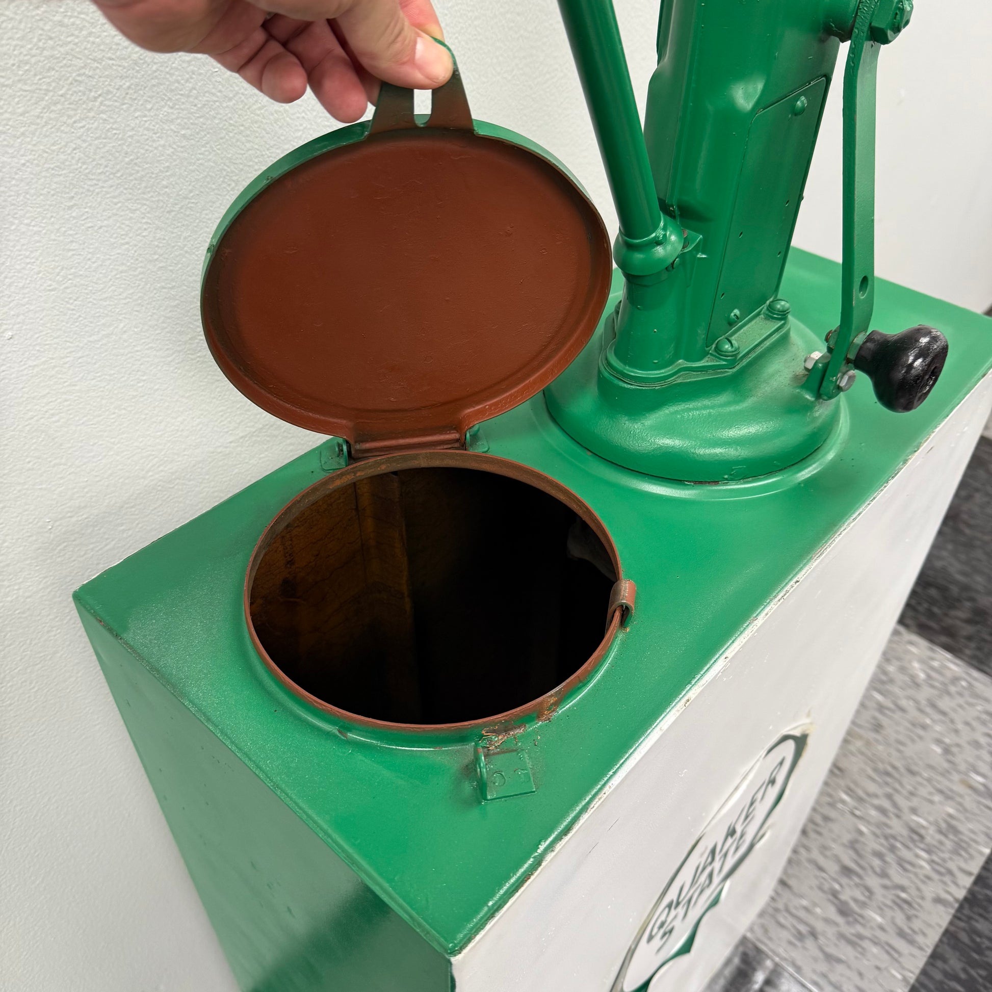 Vintage lubester finished in green and white Quaker State vinyl decals. The decal on each side of the lubester is peeling as shown. This lubester was more freshened up for display purposes, versus a restoration. There are still dents below the paint as shown. The paint is dry, or light on some spots as shown as well. Lubester still presents great, and would make an awesome addition to any collection. The pump has a Pennsylvania approval serial NO 16 on the tag.