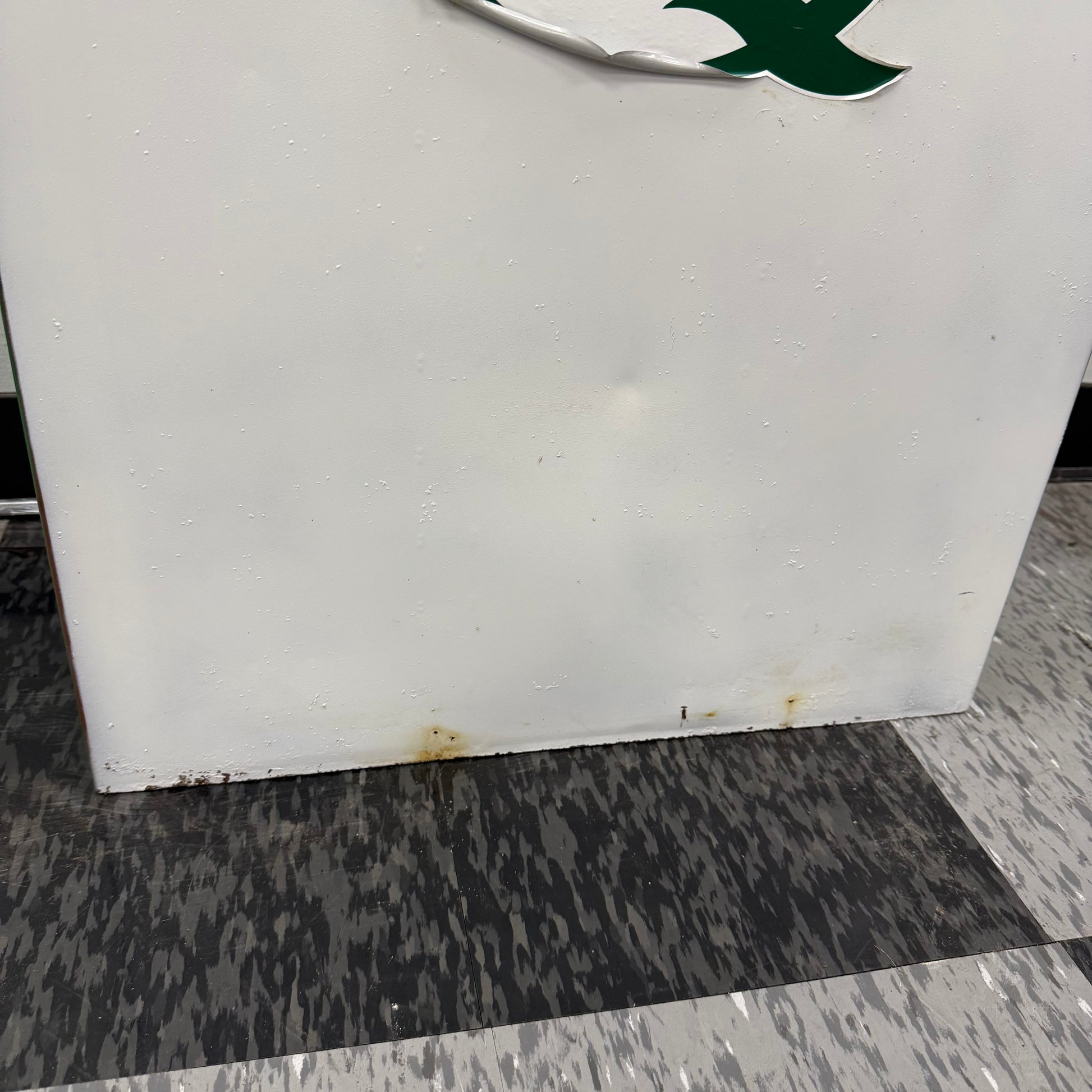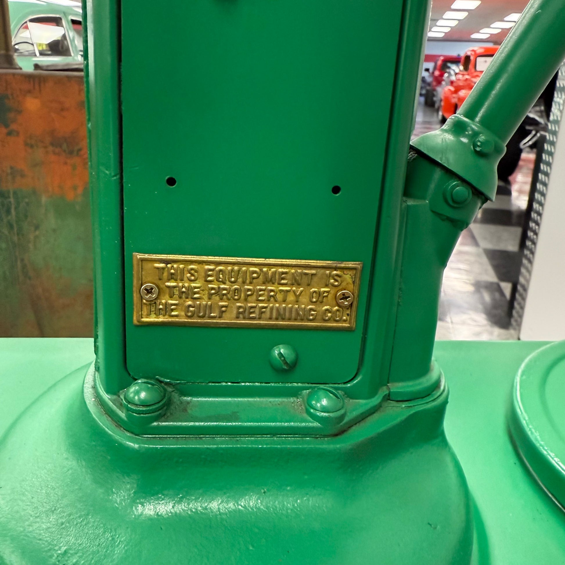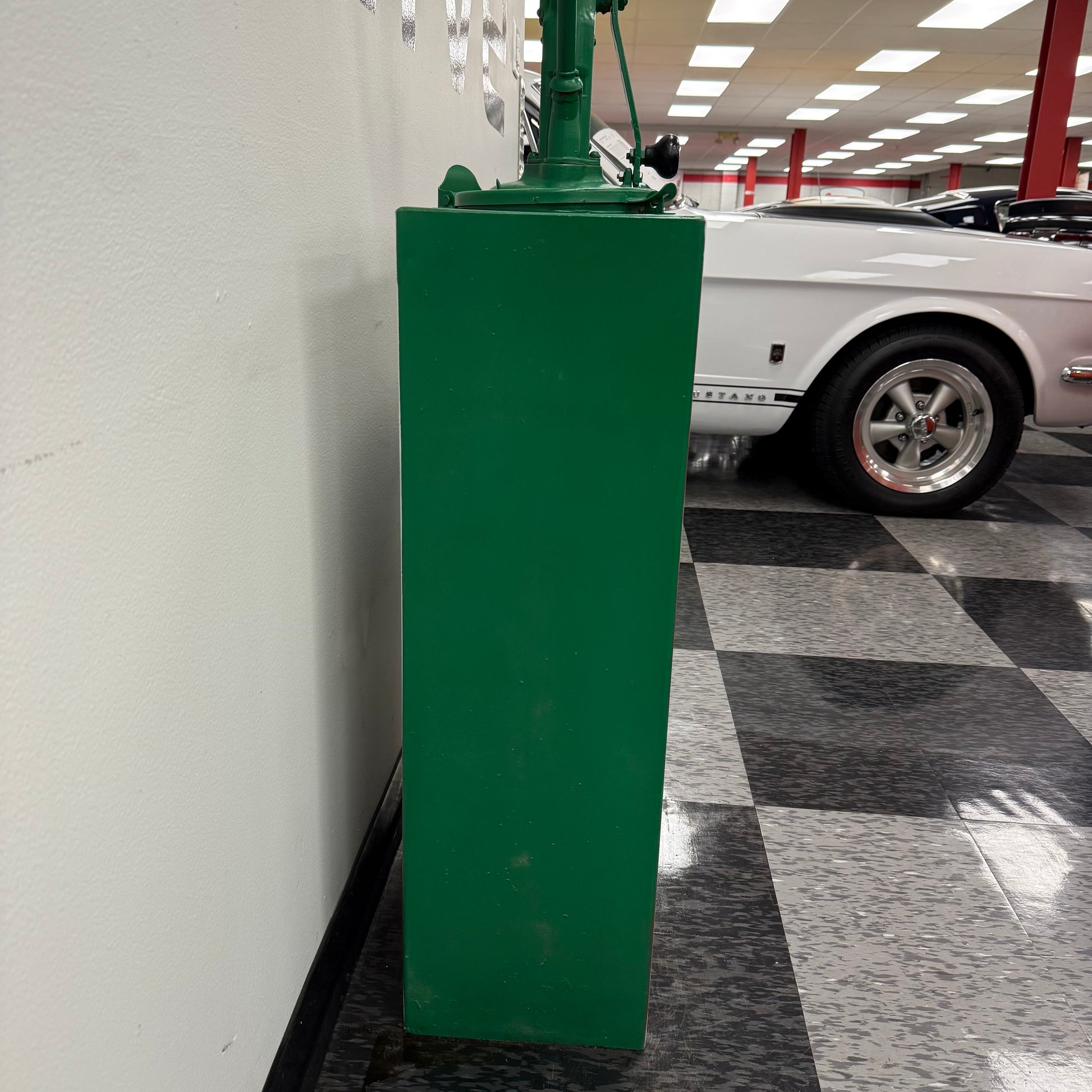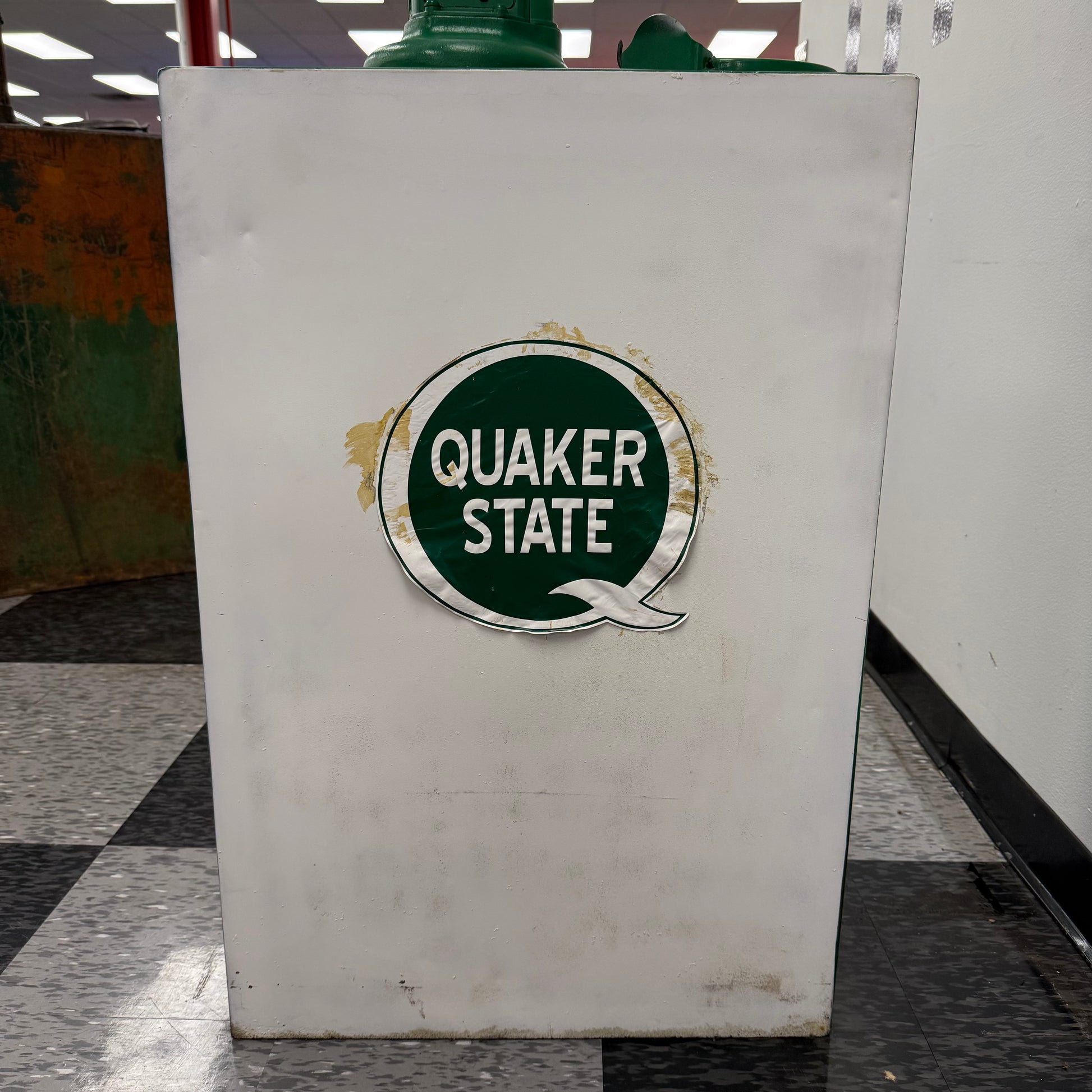 Vintage lubester finished in green and white Quaker State vinyl decals. The decal on each side of the lubester is peeling as shown. This lubester was more freshened up for display purposes, versus a restoration. There are still dents below the paint as shown. The paint is dry, or light on some spots as shown as well. Lubester still presents great, and would make an awesome addition to any collection. The pump has a Pennsylvania approval serial NO 16 on the tag.