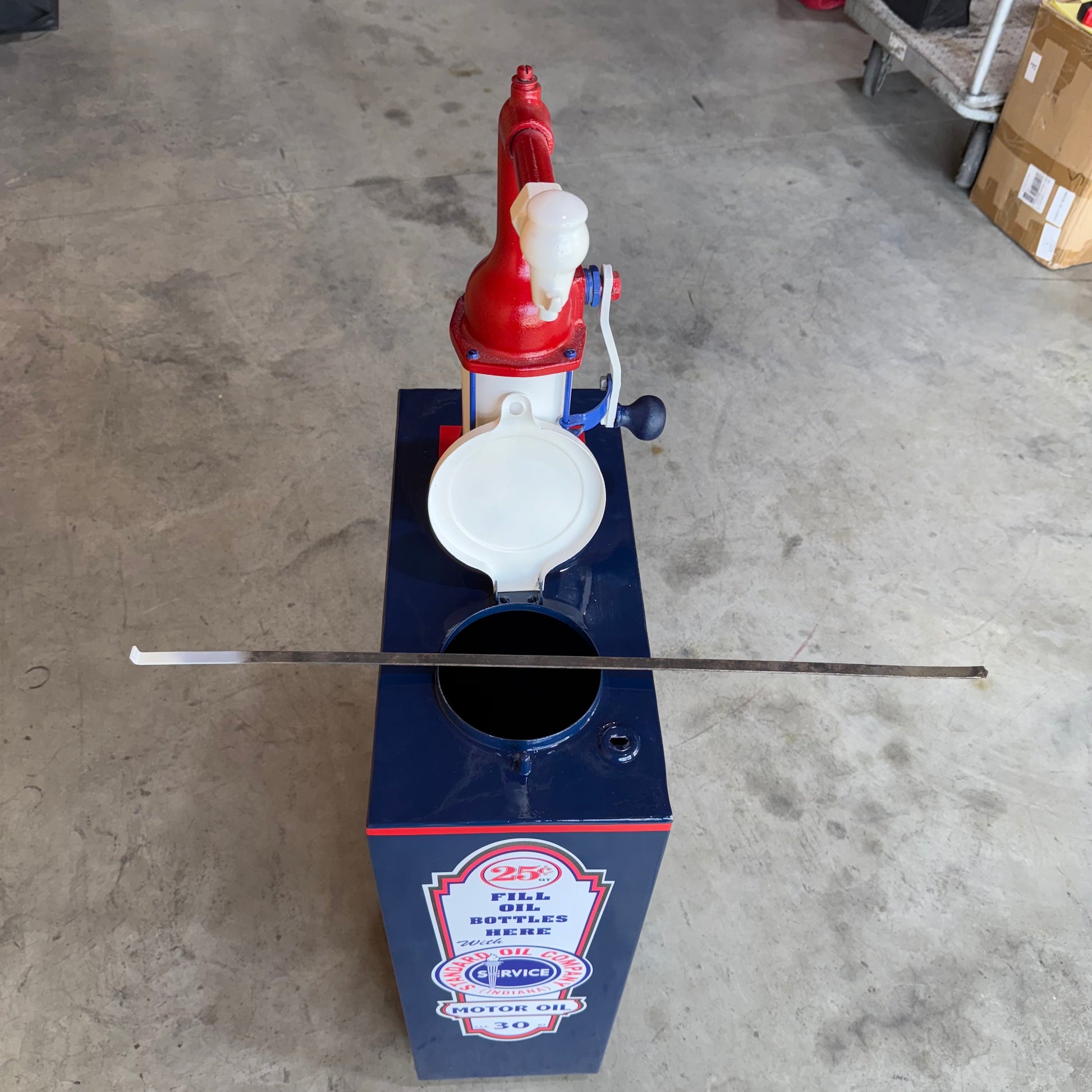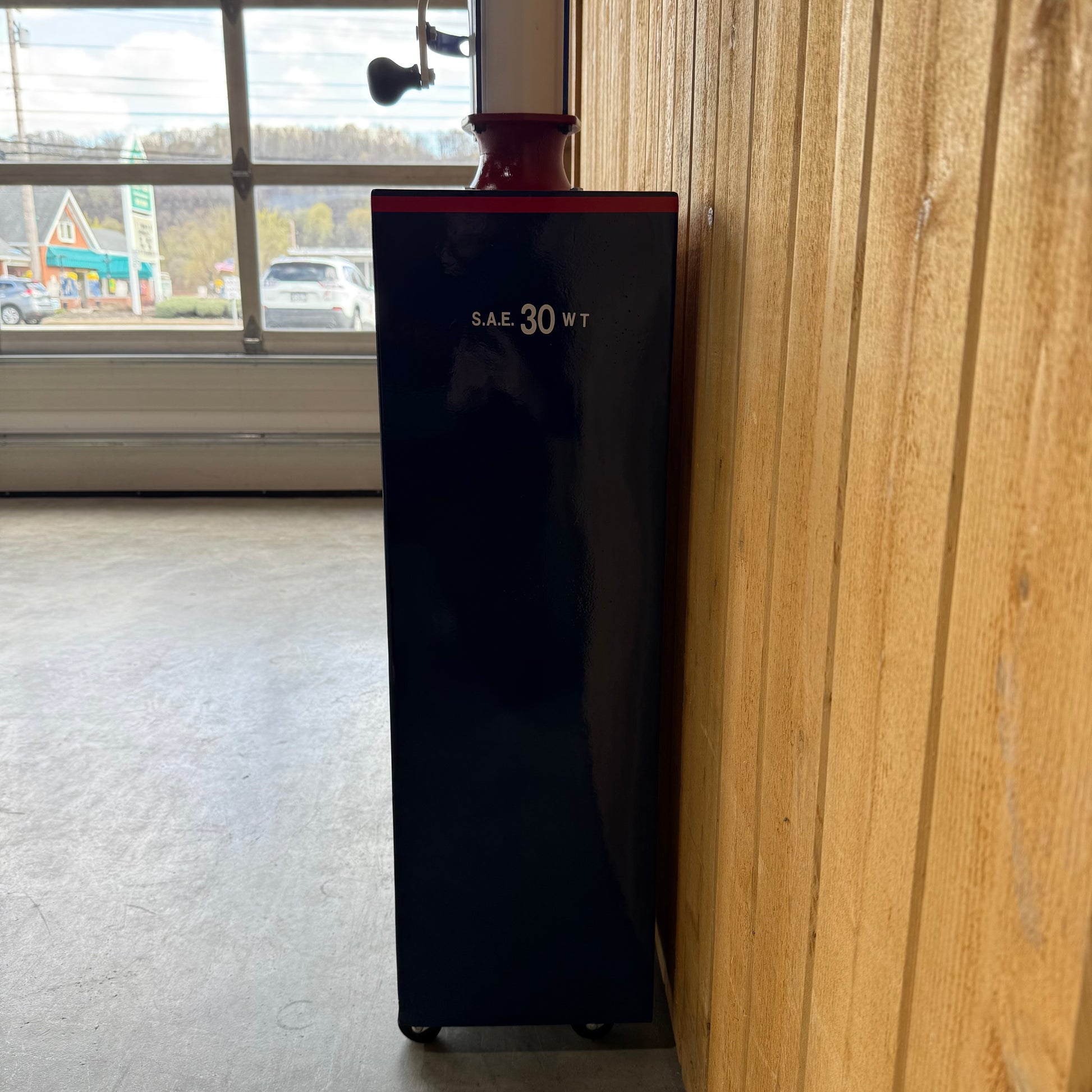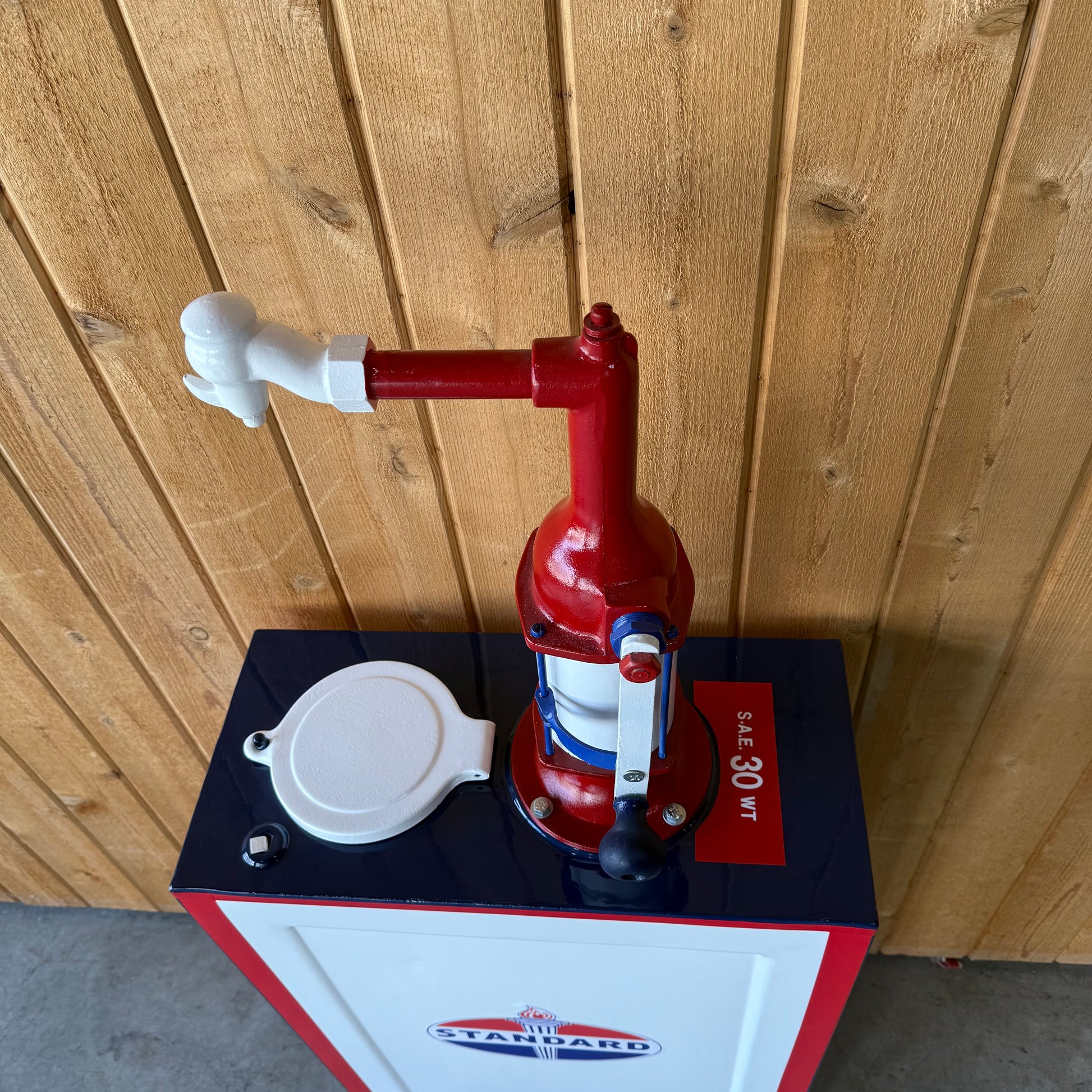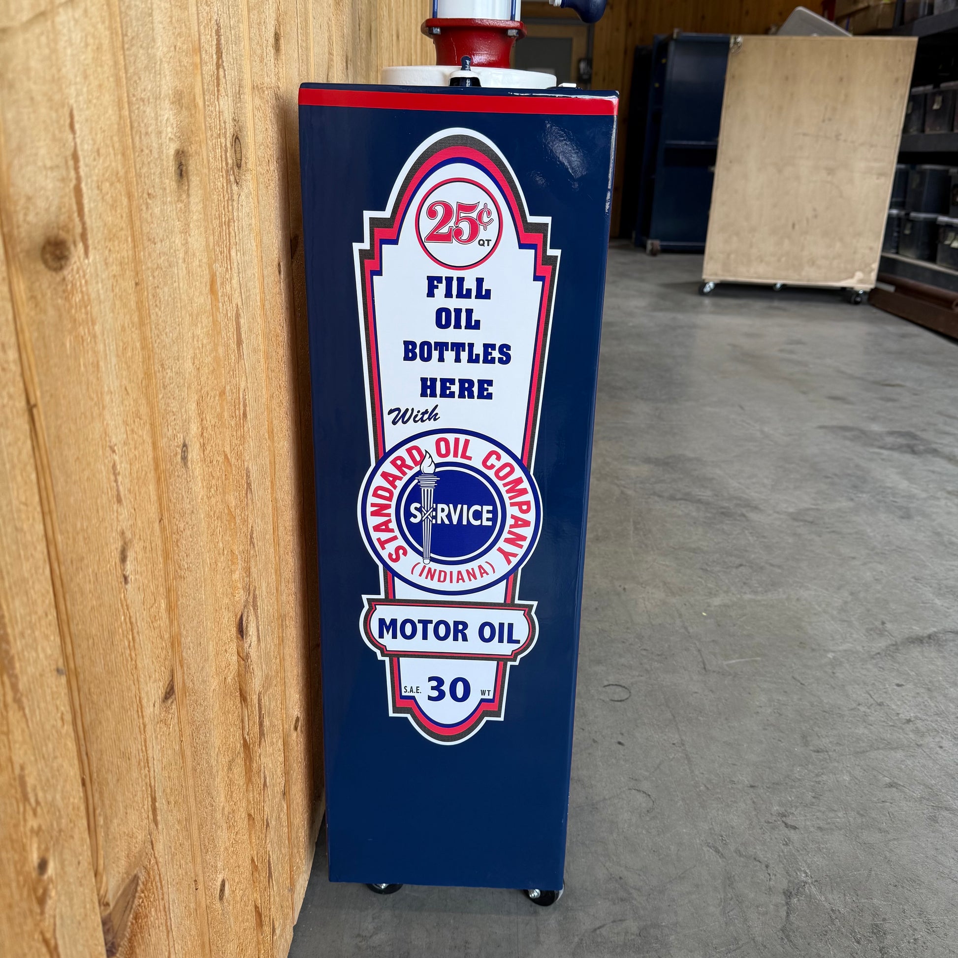 Vintage lubester that has been nicely restored. This lubester has been refinished in the Standard Oil theme and colors. The Standard is a vinyl decal. The indicator can be removed as shown. The pump handle does not have a part number embossed in it. By design of the pump, we believe it to be a Wayne model, but not can verify for sure. There are also casters on the underside that allow the lubester to roll. This has been on display for the past three years at our dealership, but overall this lubester presents itself very well. This beautiful piece would be a great additon to any collection.