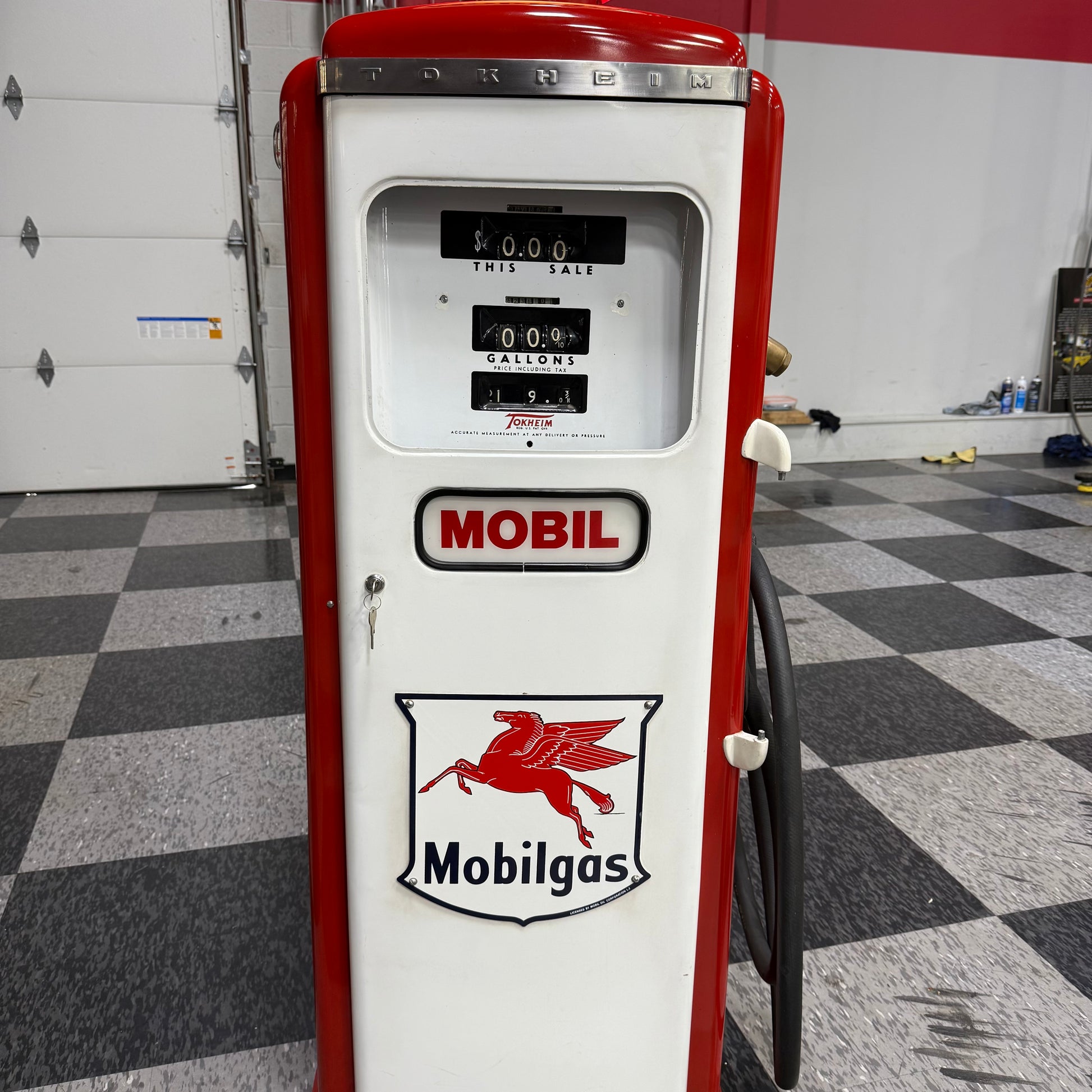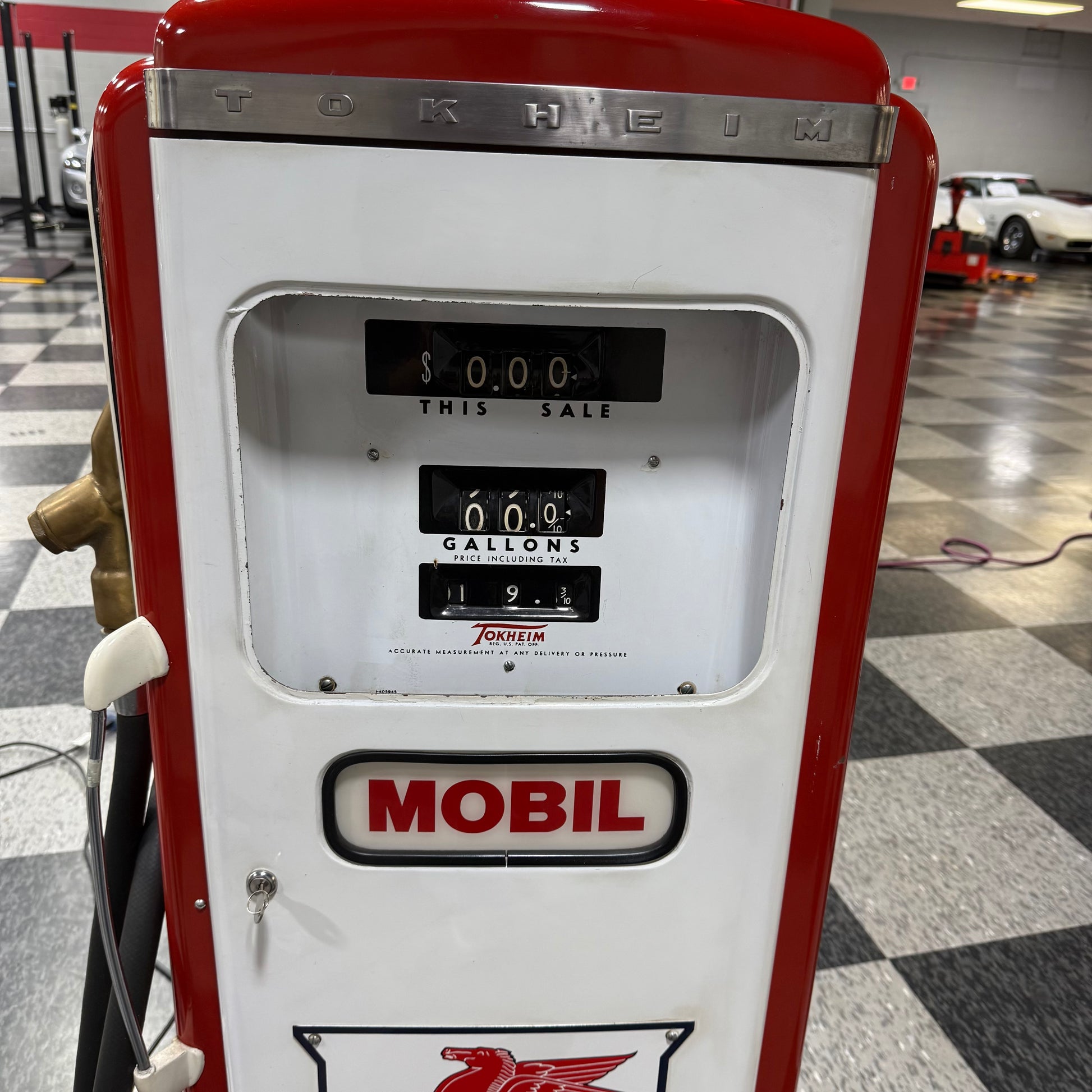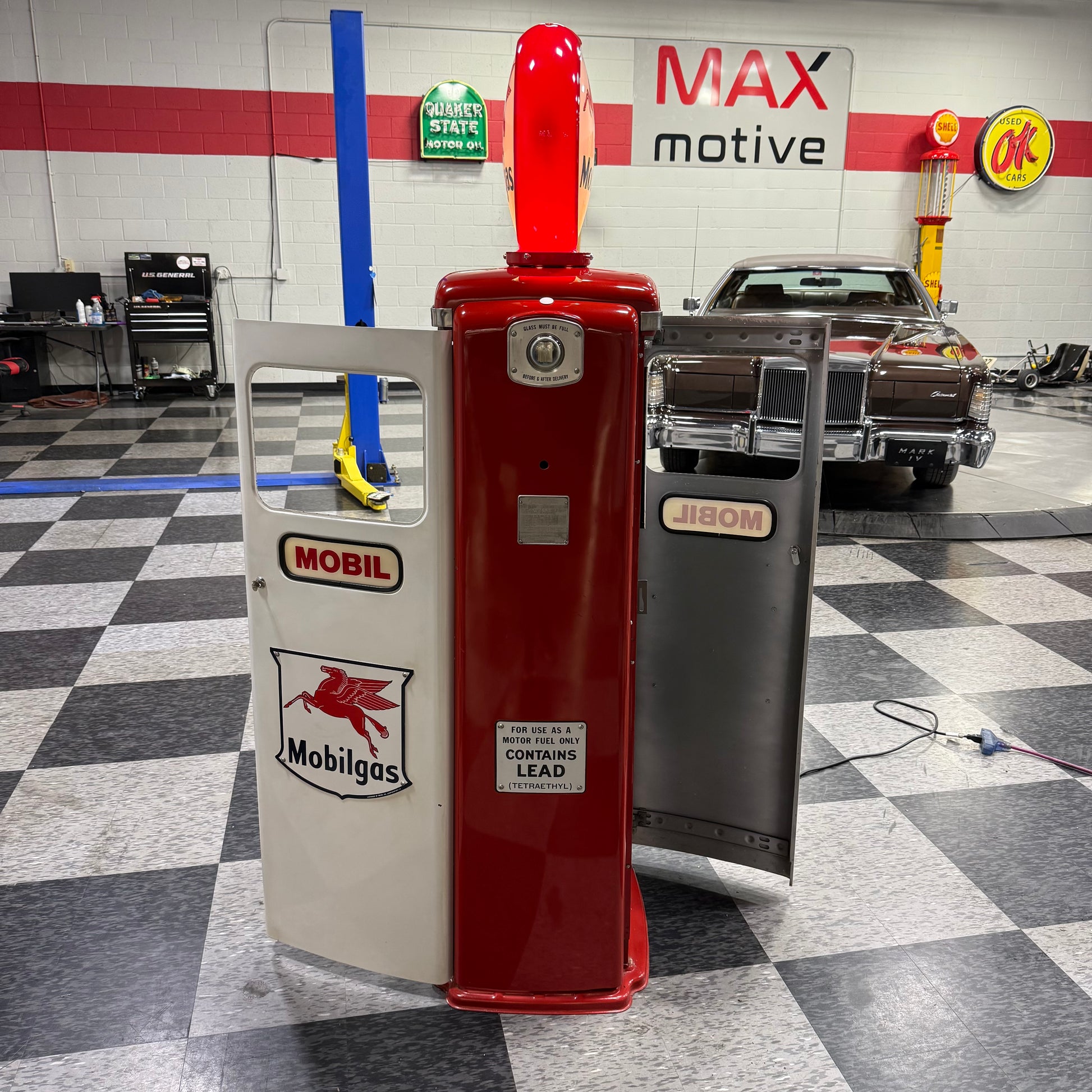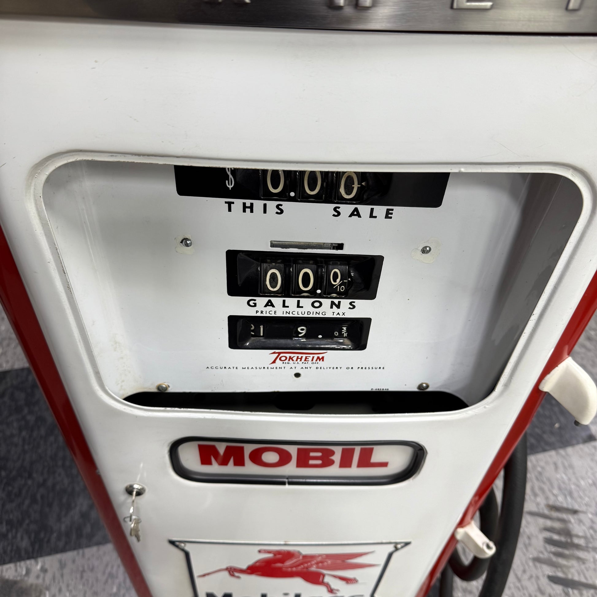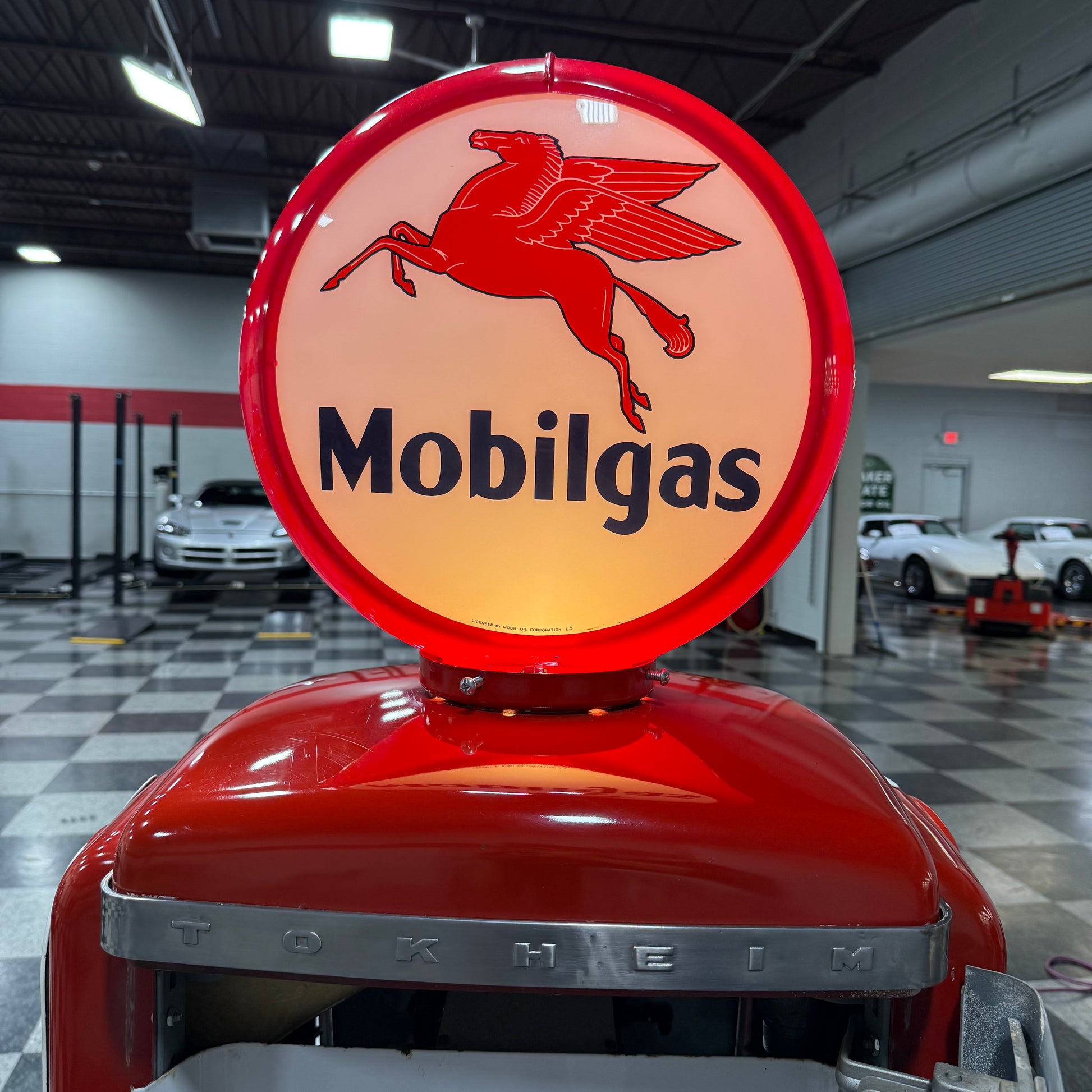 This vintage Mobilgas 39 Tokheim pump is ready for her new home and up for sale as the dealership downsizes it's collection. This is a Model 39 original pump. It is a type NAP. The serial number is 828706. This pump was usually found in the late 1940's and early 1950's. The remaining mechanisms inside are included, but this is a non-functional pump being sold for display. Both doors of the pump open. The globe on top is a re-production globe. The glass on each side is missing as shown in the photos. This is an older restoration, and has been used for displays at multiple car shows. There are some marks and scrapes as pictured. Beautiful antique piece ready to join your collection or car cave.