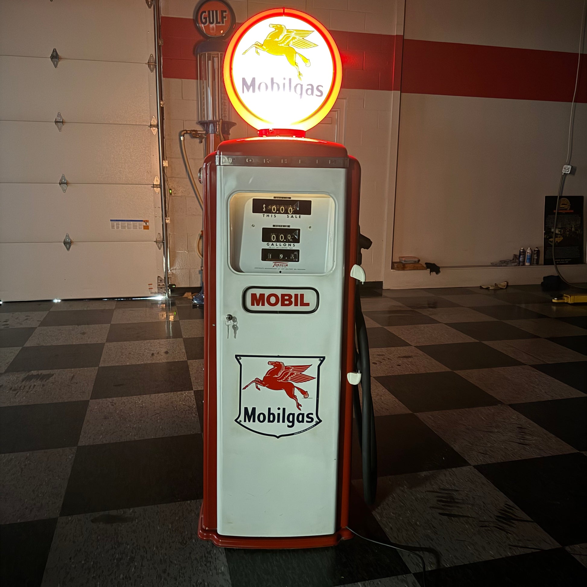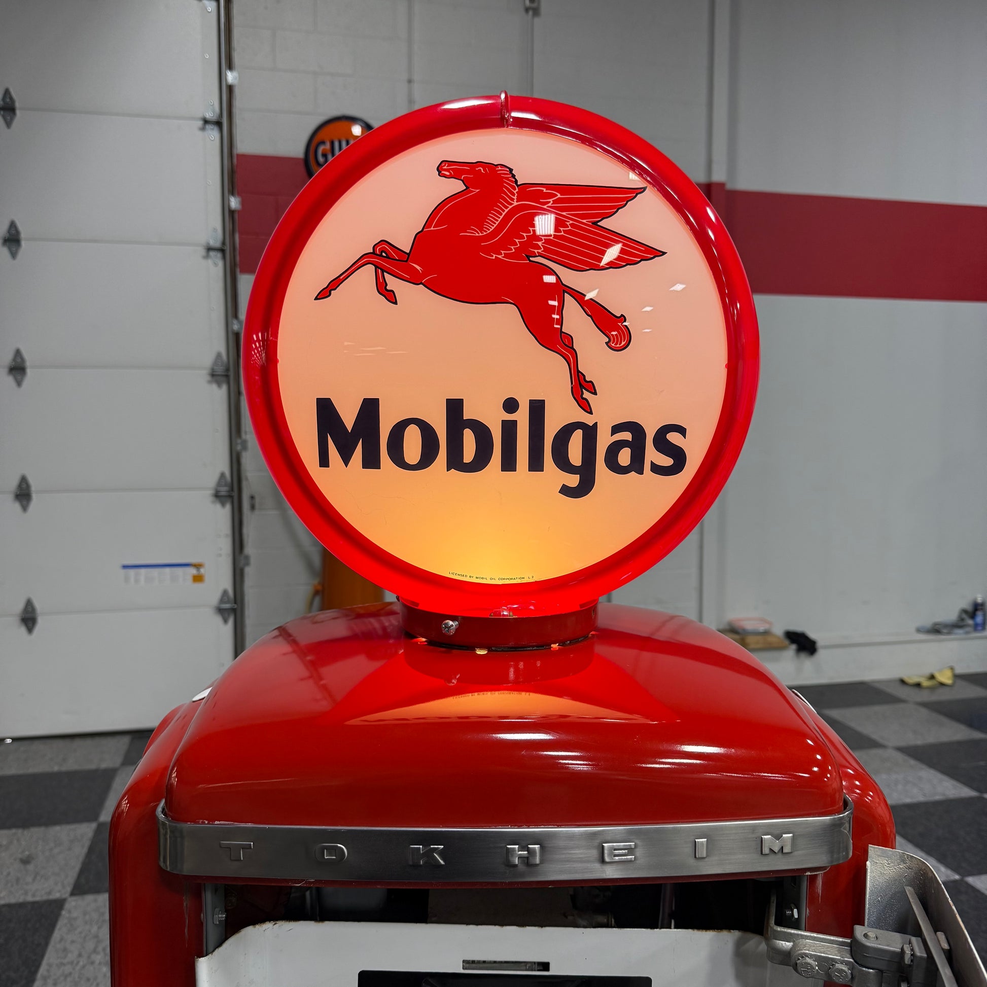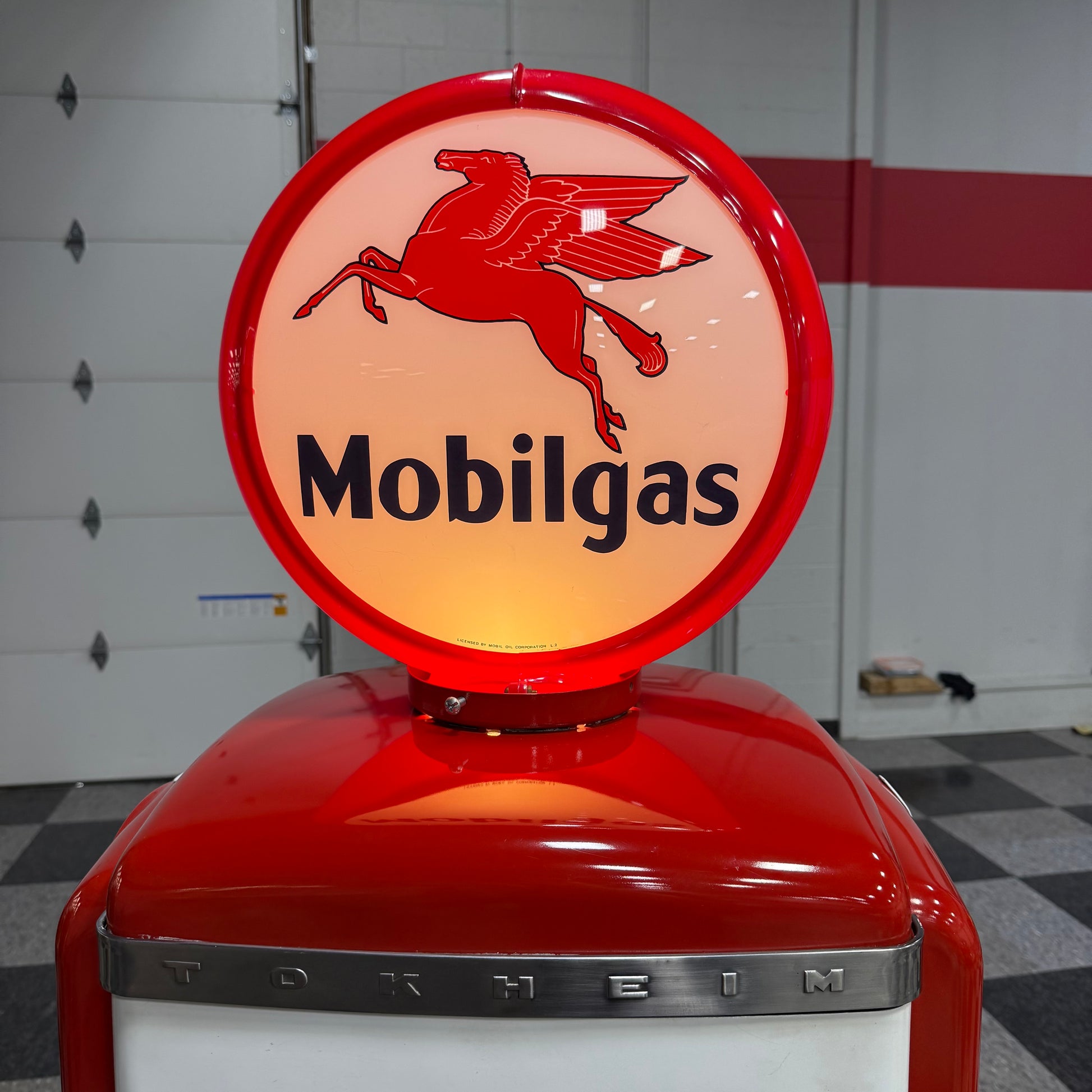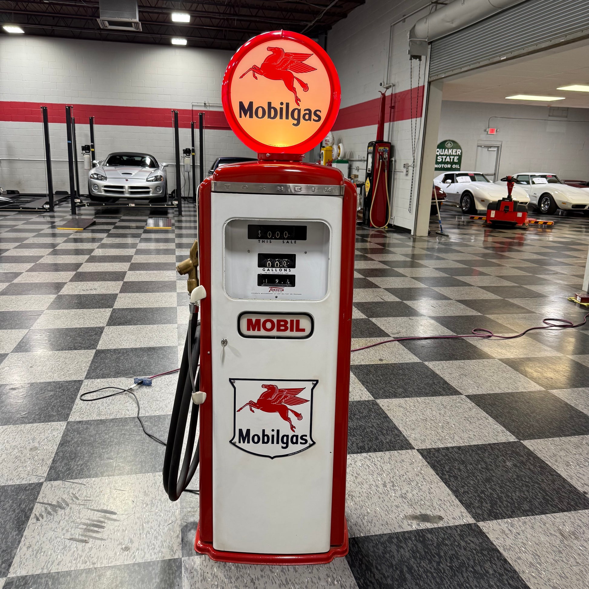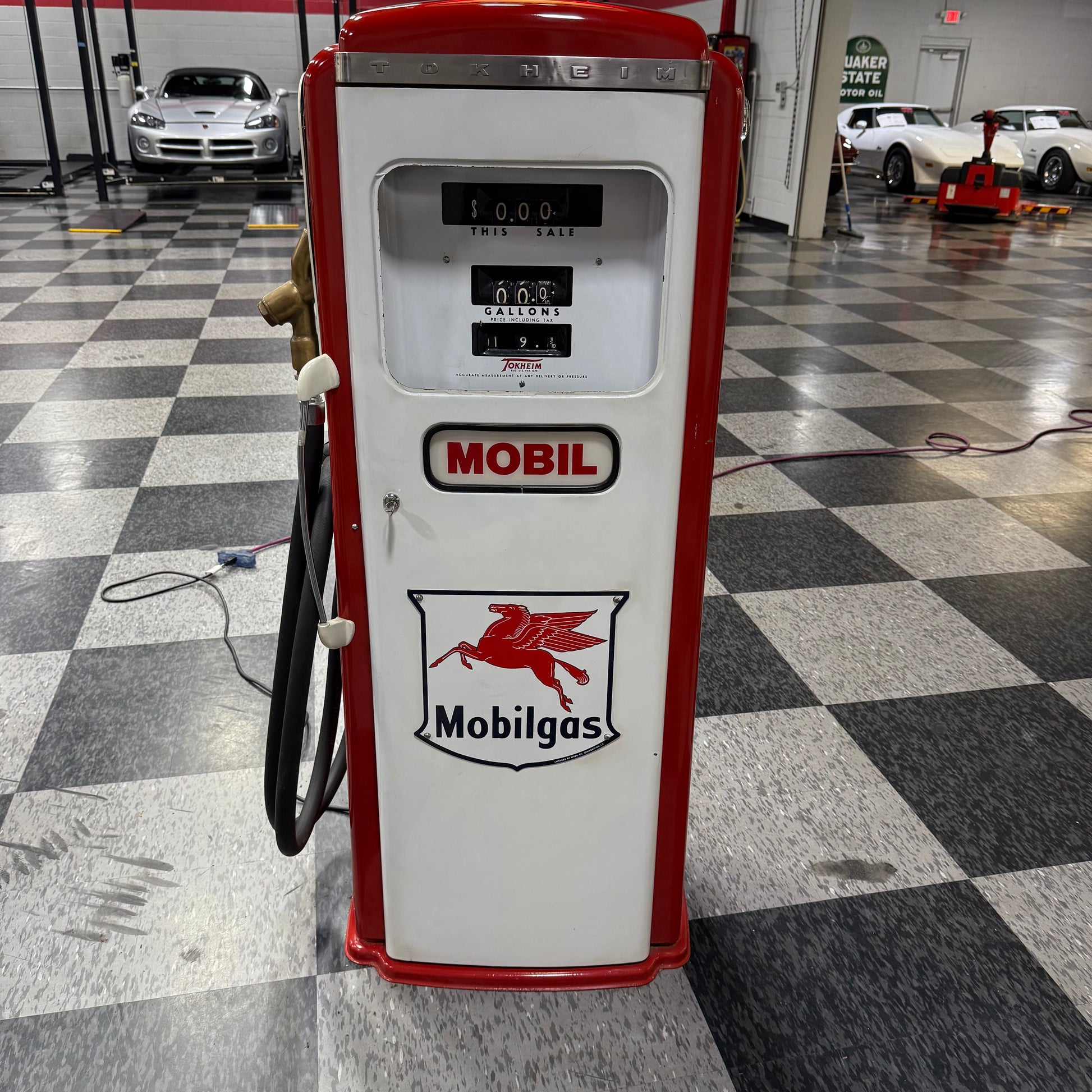 This vintage Mobilgas 39 Tokheim pump is ready for her new home and up for sale as the dealership downsizes it's collection. This is a Model 39 original pump. It is a type NAP. The serial number is 828706. This pump was usually found in the late 1940's and early 1950's. The remaining mechanisms inside are included, but this is a non-functional pump being sold for display. Both doors of the pump open. The globe on top is a re-production globe. The glass on each side is missing as shown in the photos. This is an older restoration, and has been used for displays at multiple car shows. There are some marks and scrapes as pictured. Beautiful antique piece ready to join your collection or car cave.