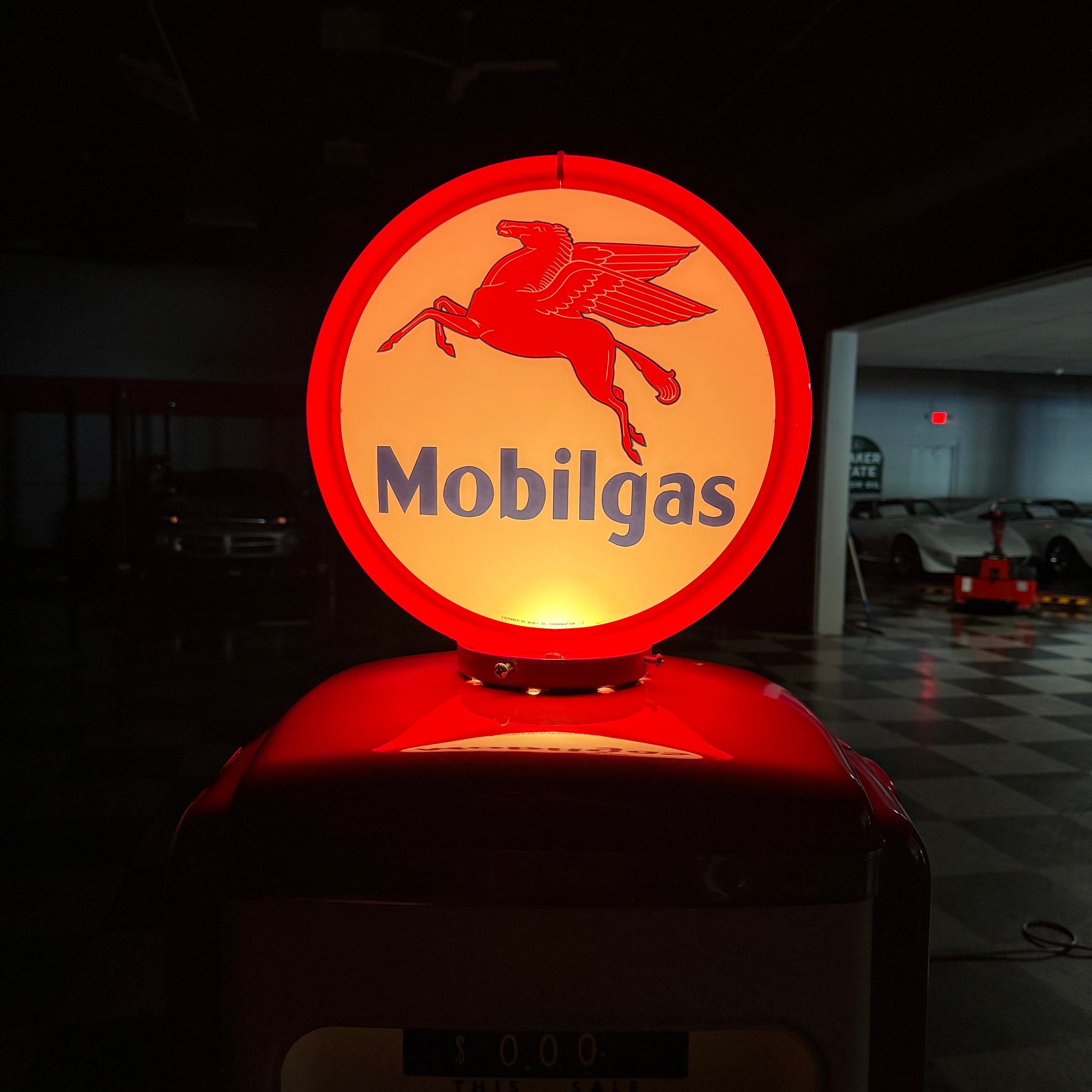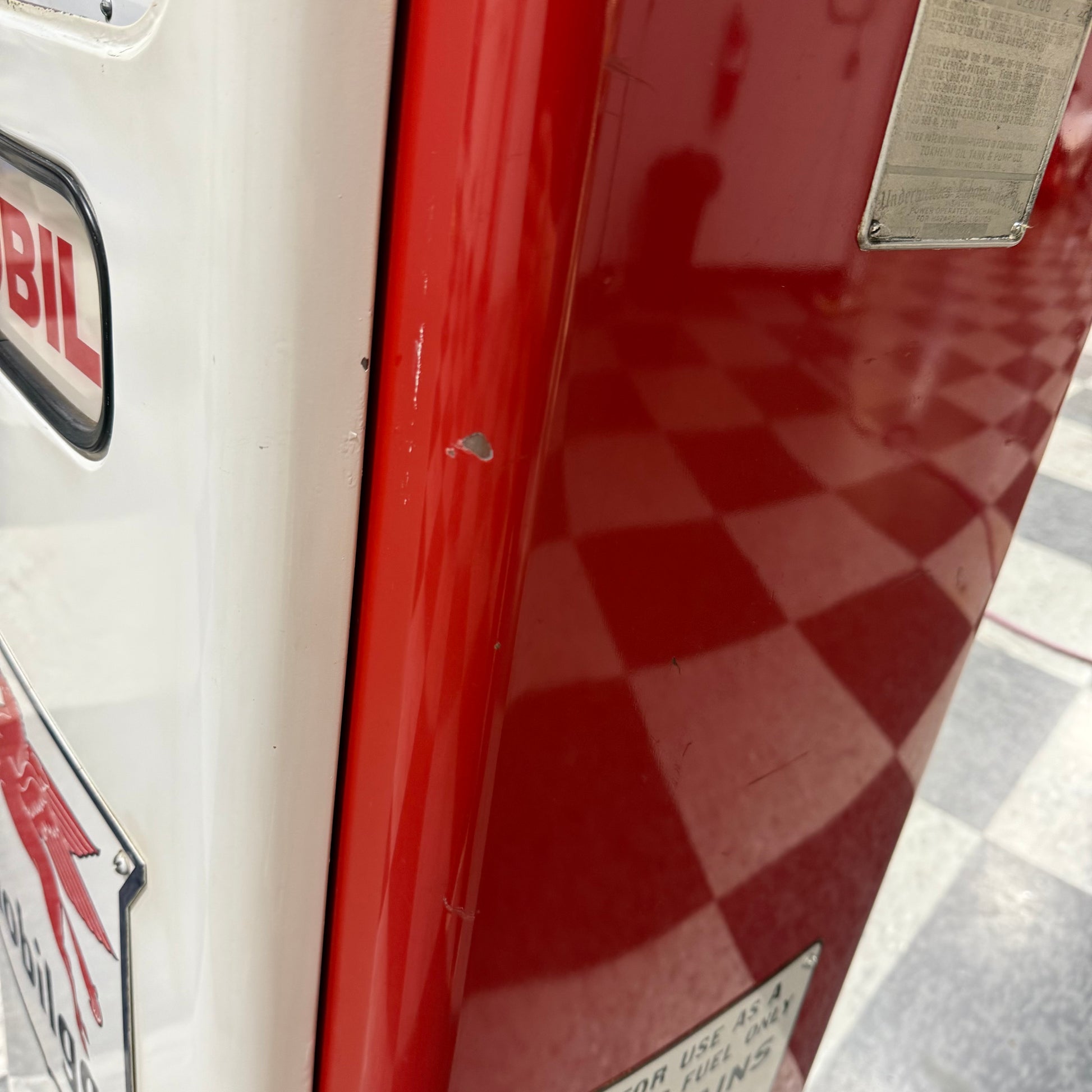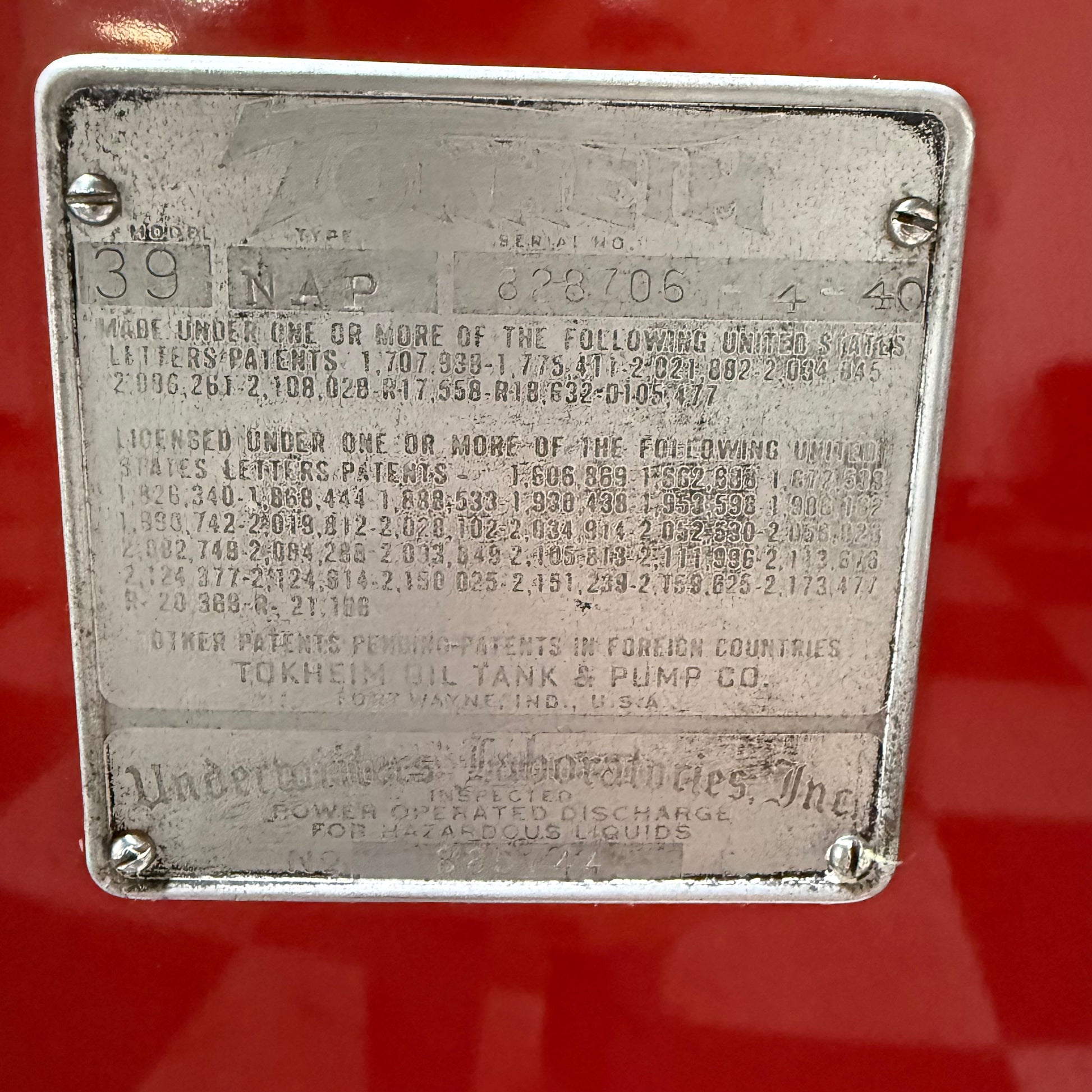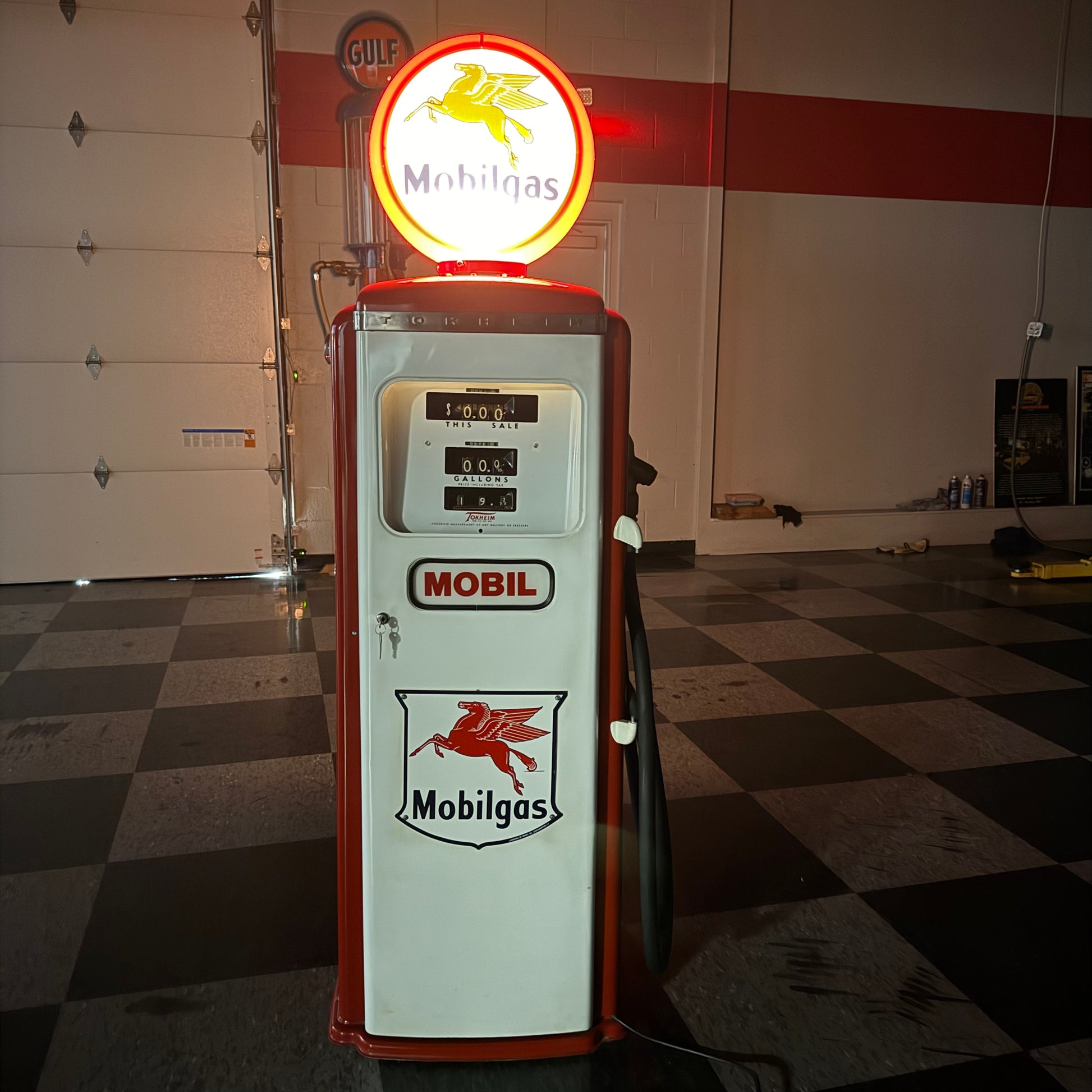 This vintage Mobilgas 39 Tokheim pump is ready for her new home and up for sale as the dealership downsizes it's collection. This is a Model 39 original pump. It is a type NAP. The serial number is 828706. This pump was usually found in the late 1940's and early 1950's. The remaining mechanisms inside are included, but this is a non-functional pump being sold for display. Both doors of the pump open. The globe on top is a re-production globe. The glass on each side is missing as shown in the photos. This is an older restoration, and has been used for displays at multiple car shows. There are some marks and scrapes as pictured. Beautiful antique piece ready to join your collection or car cave.