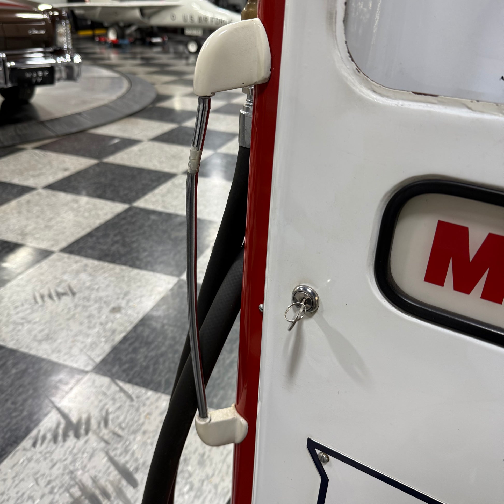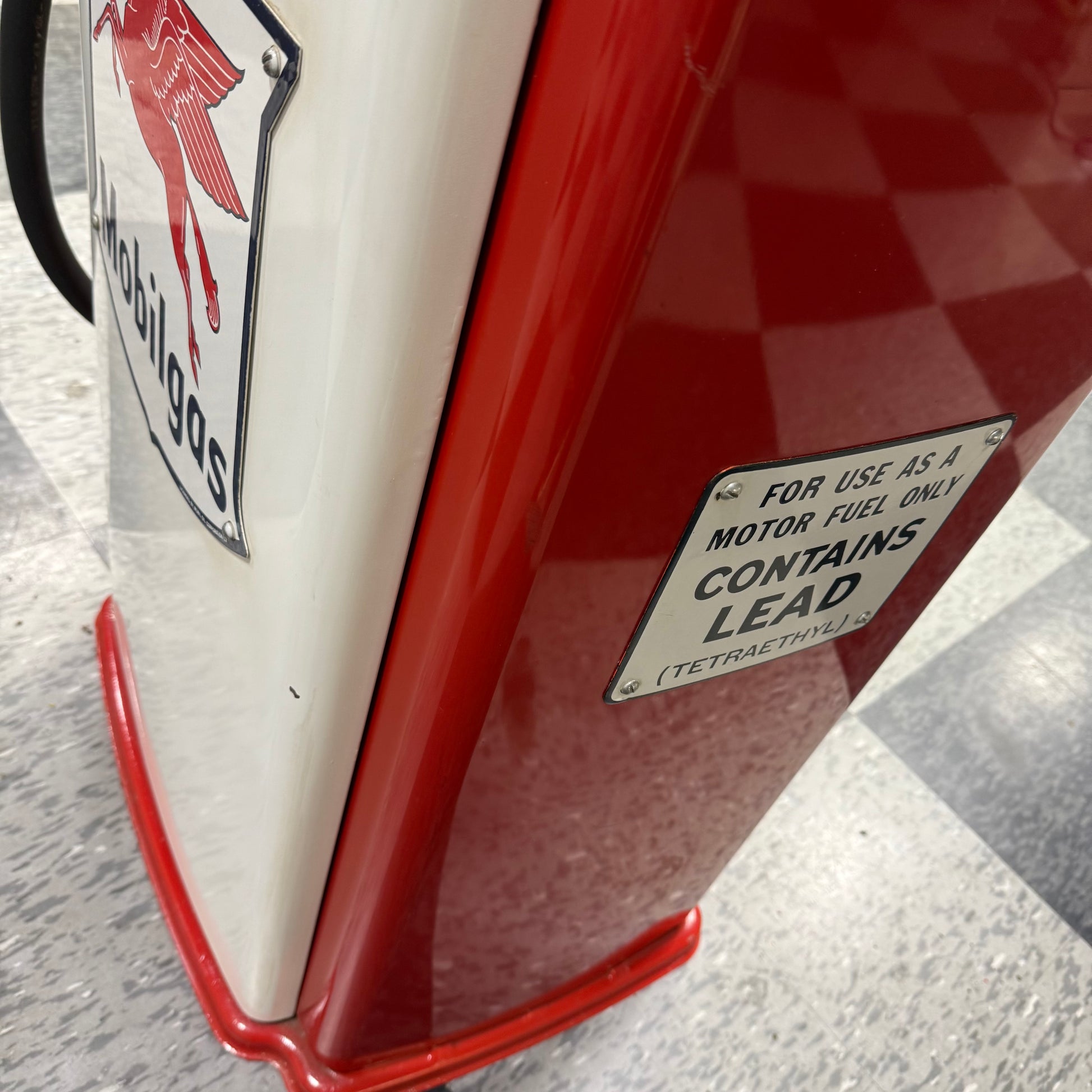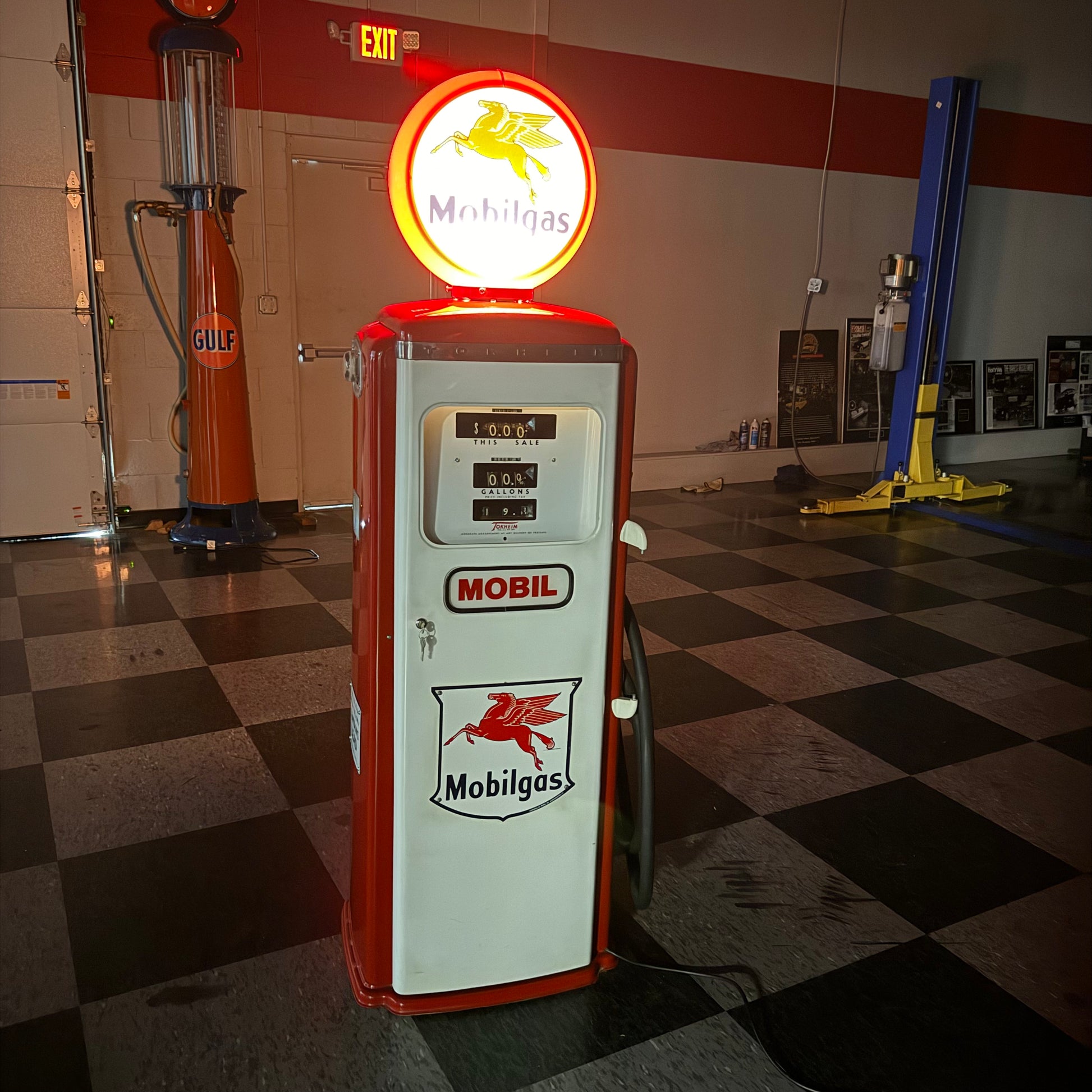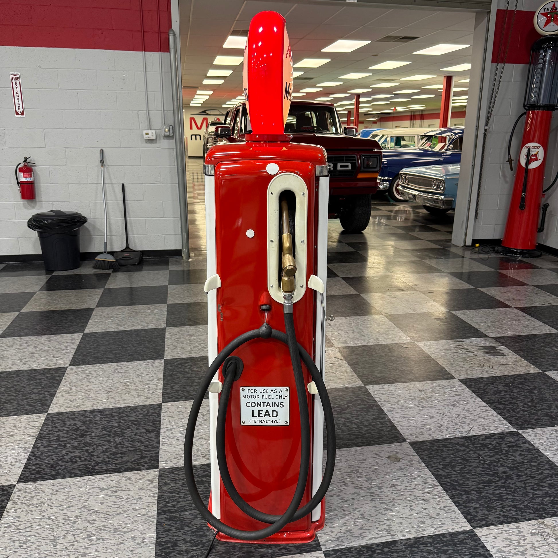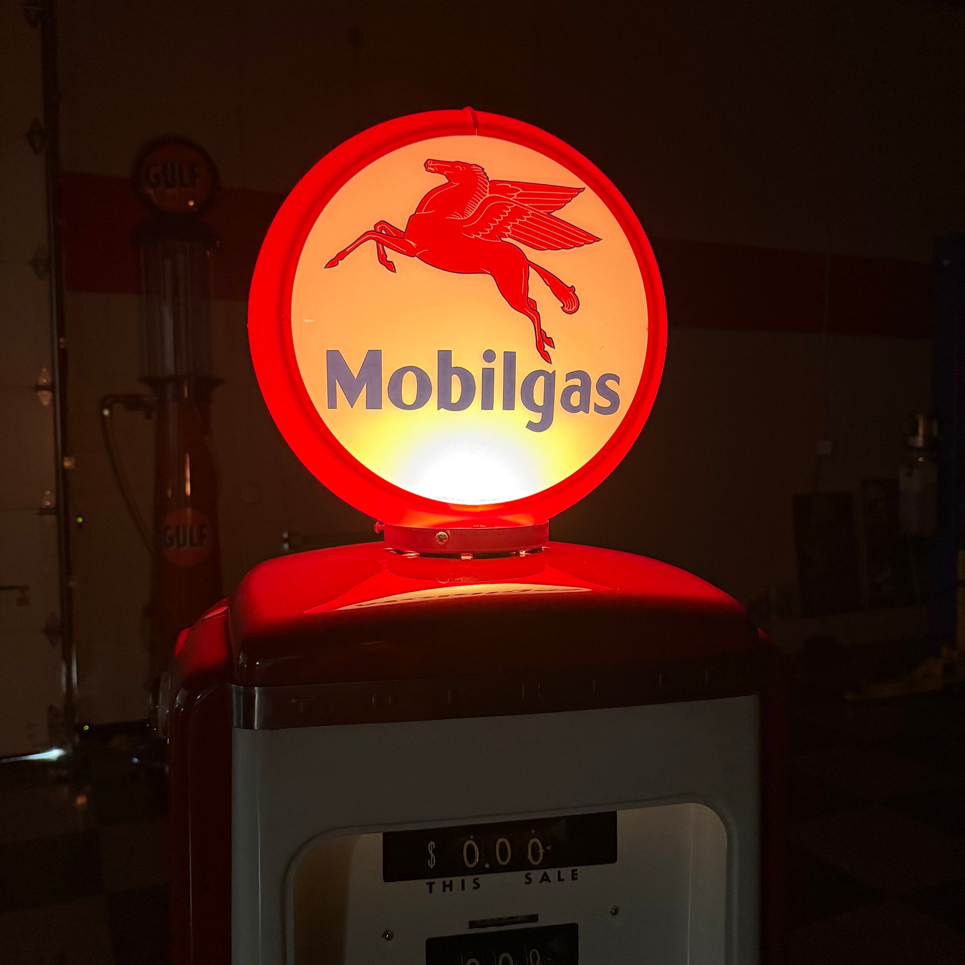 This vintage Mobilgas 39 Tokheim pump is ready for her new home and up for sale as the dealership downsizes it's collection. This is a Model 39 original pump. It is a type NAP. The serial number is 828706. This pump was usually found in the late 1940's and early 1950's. The remaining mechanisms inside are included, but this is a non-functional pump being sold for display. Both doors of the pump open. The globe on top is a re-production globe. The glass on each side is missing as shown in the photos. This is an older restoration, and has been used for displays at multiple car shows. There are some marks and scrapes as pictured. Beautiful antique piece ready to join your collection or car cave.