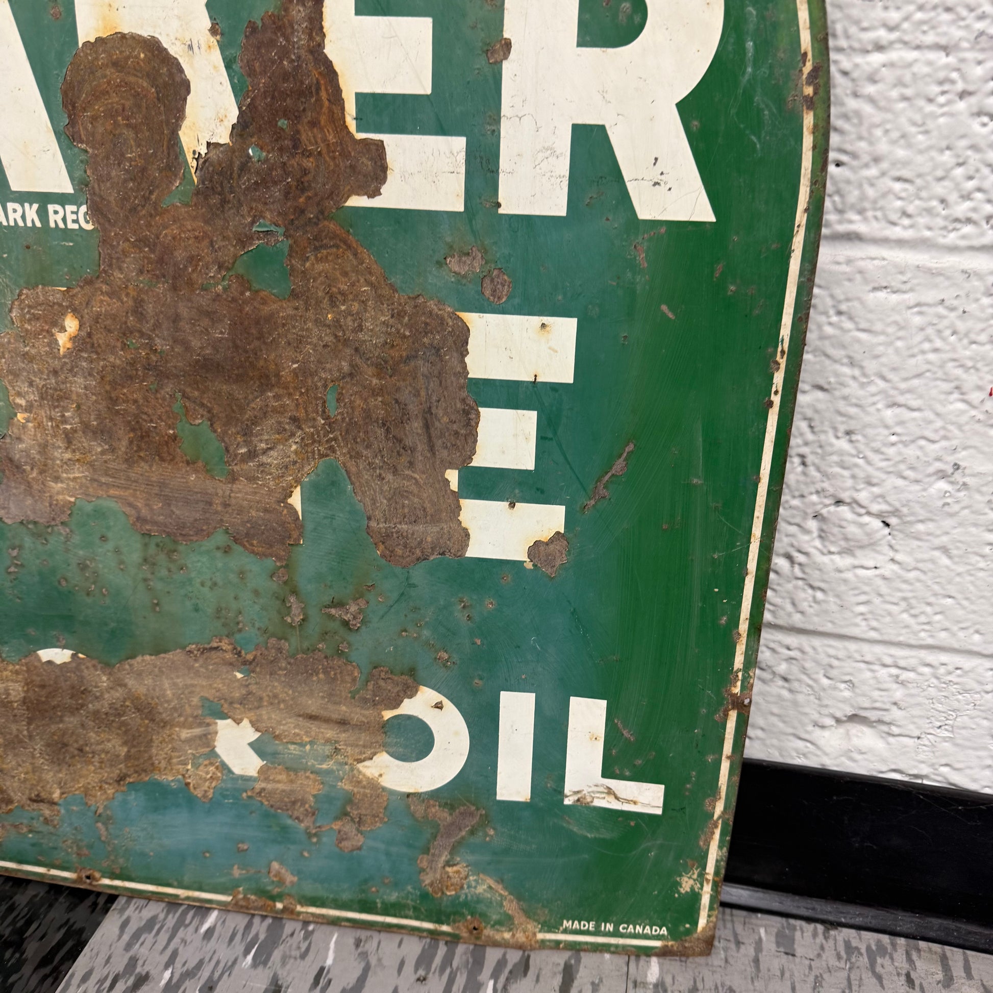 Vintage Quaker State Pennsylvania Motor Oil tombstone double sided tin sign. This vintage sign is a trade mark in Canada sign. Sign is two sided, but does show signs of it's age. There is wear and tear on both sides as pictured
